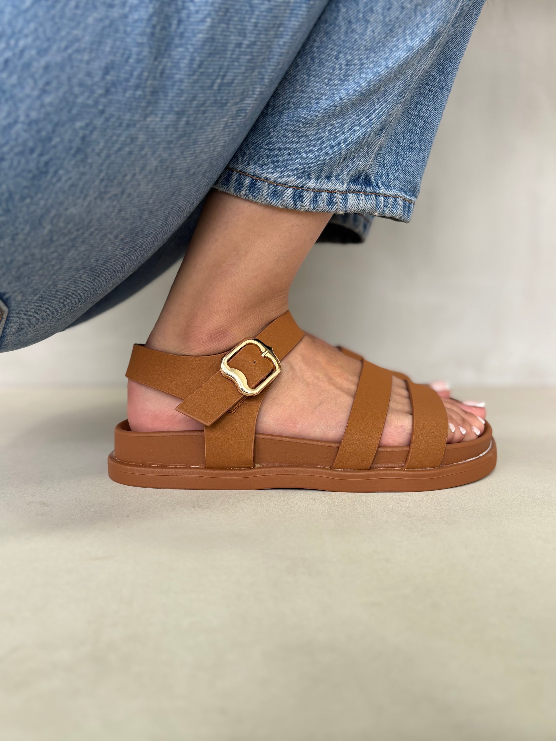 Estas sandalias camel ofrecen un equilibrio ideal entre comodidad y estilo. Su diseño de tres tiras finas con hebilla dorada aporta un toque moderno y femenino, mientras la suela ligera y la plantilla anatómica garantizan confort durante todo el día. Su tono neutro las hace fáciles de combinar con jeans, vestidos o conjuntos casuales para un look veraniego y sofisticado.