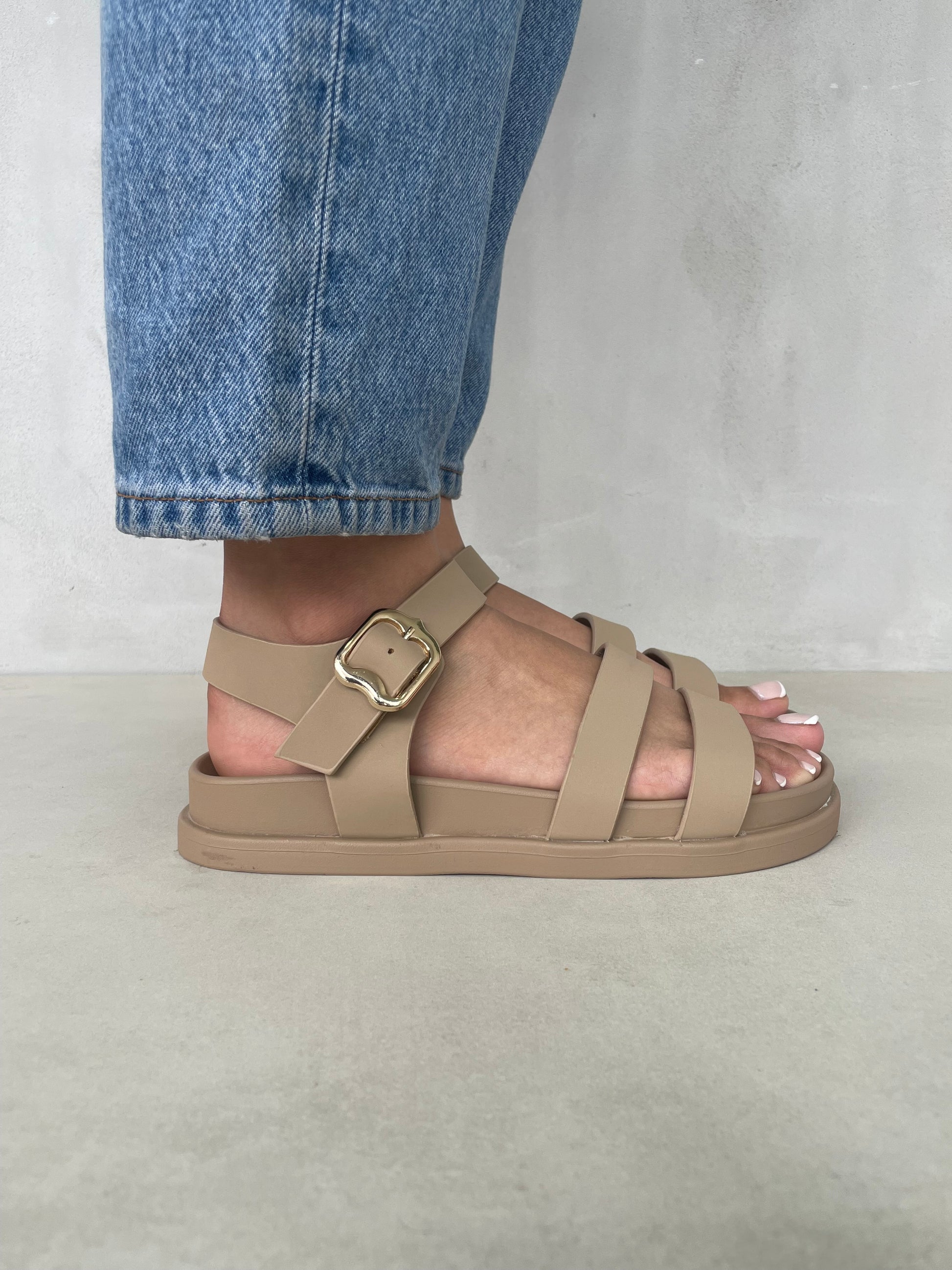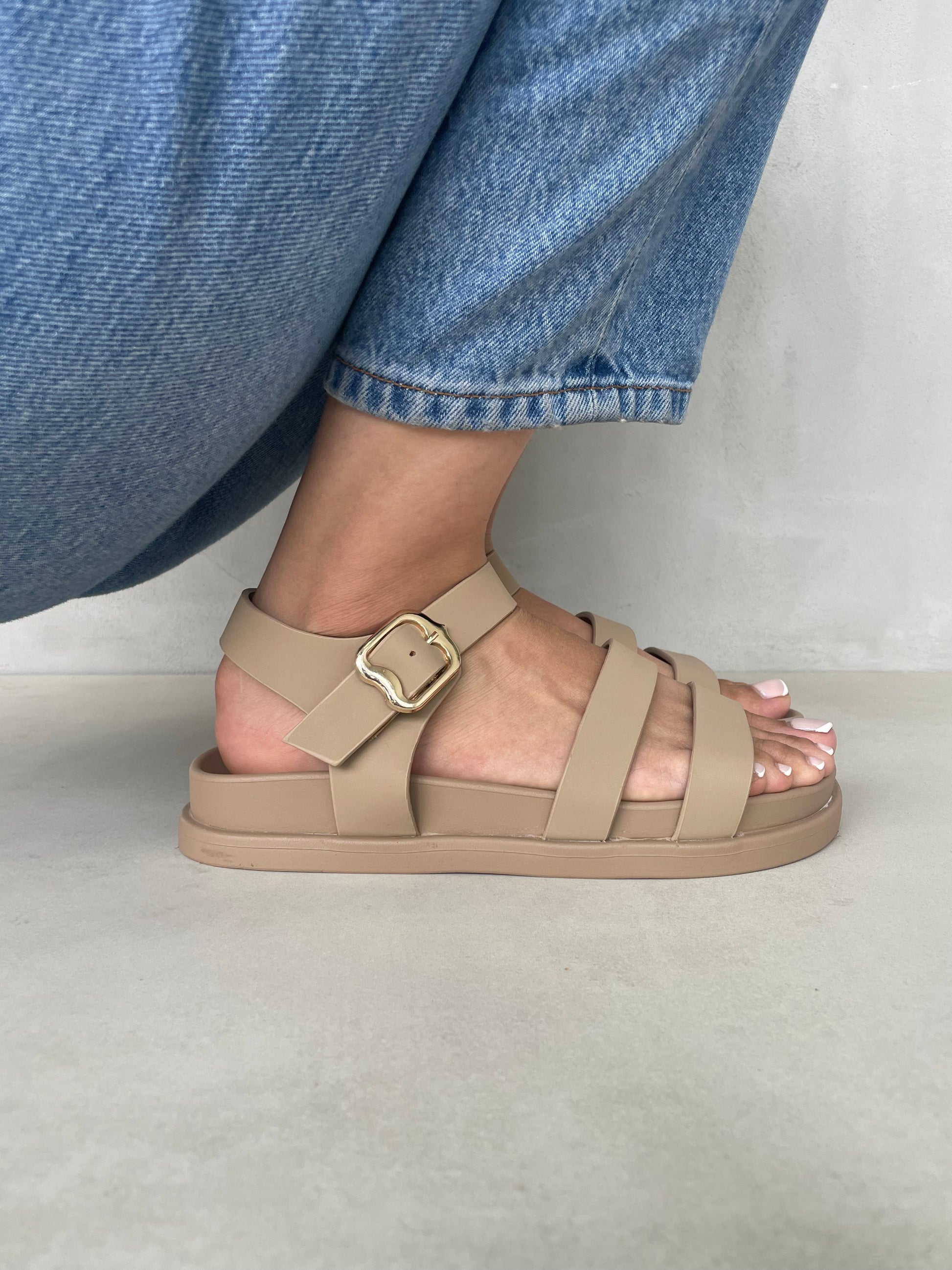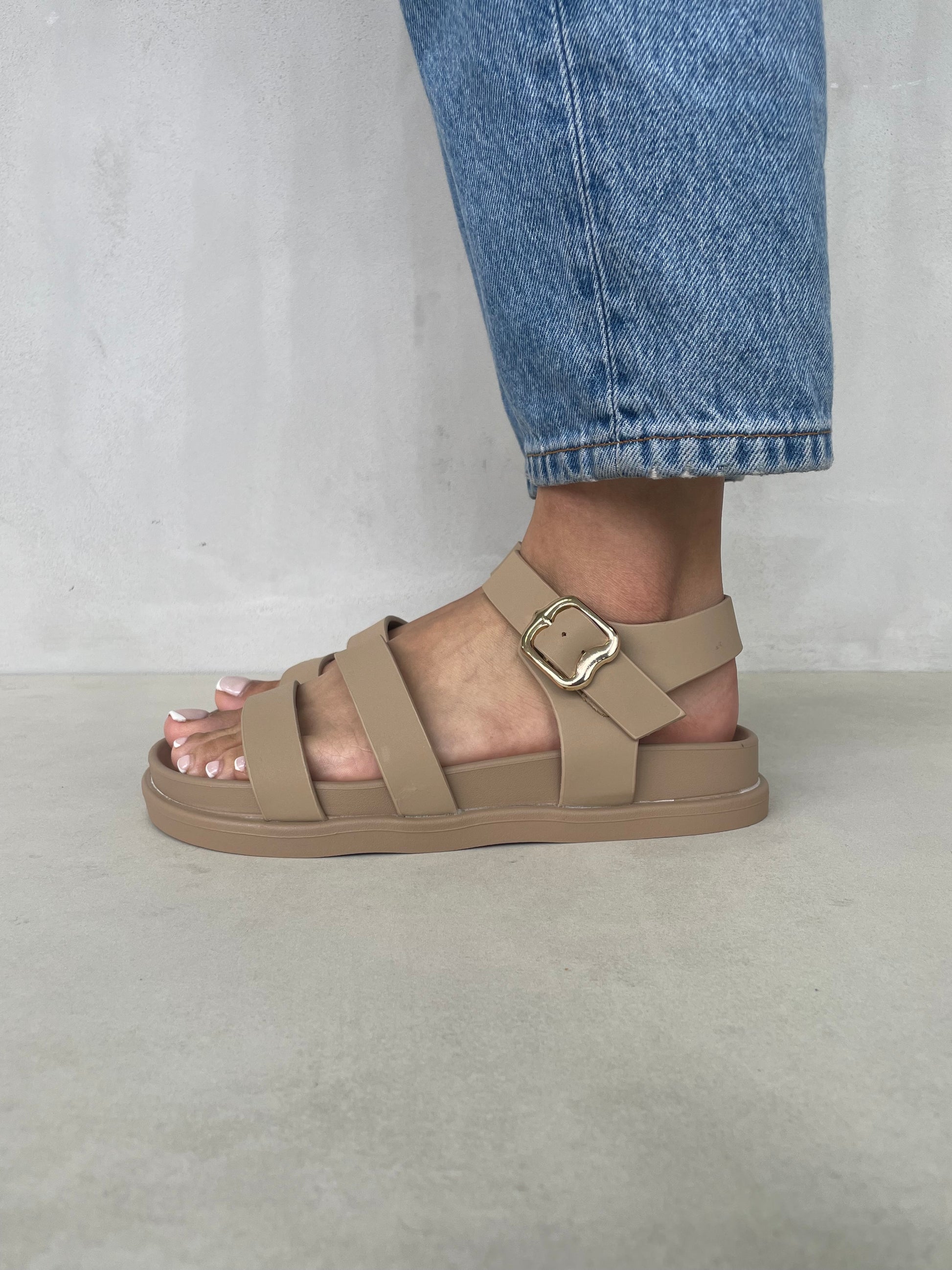 Sandalias Beige con Hebilla Dorada y Tiras Delgadas