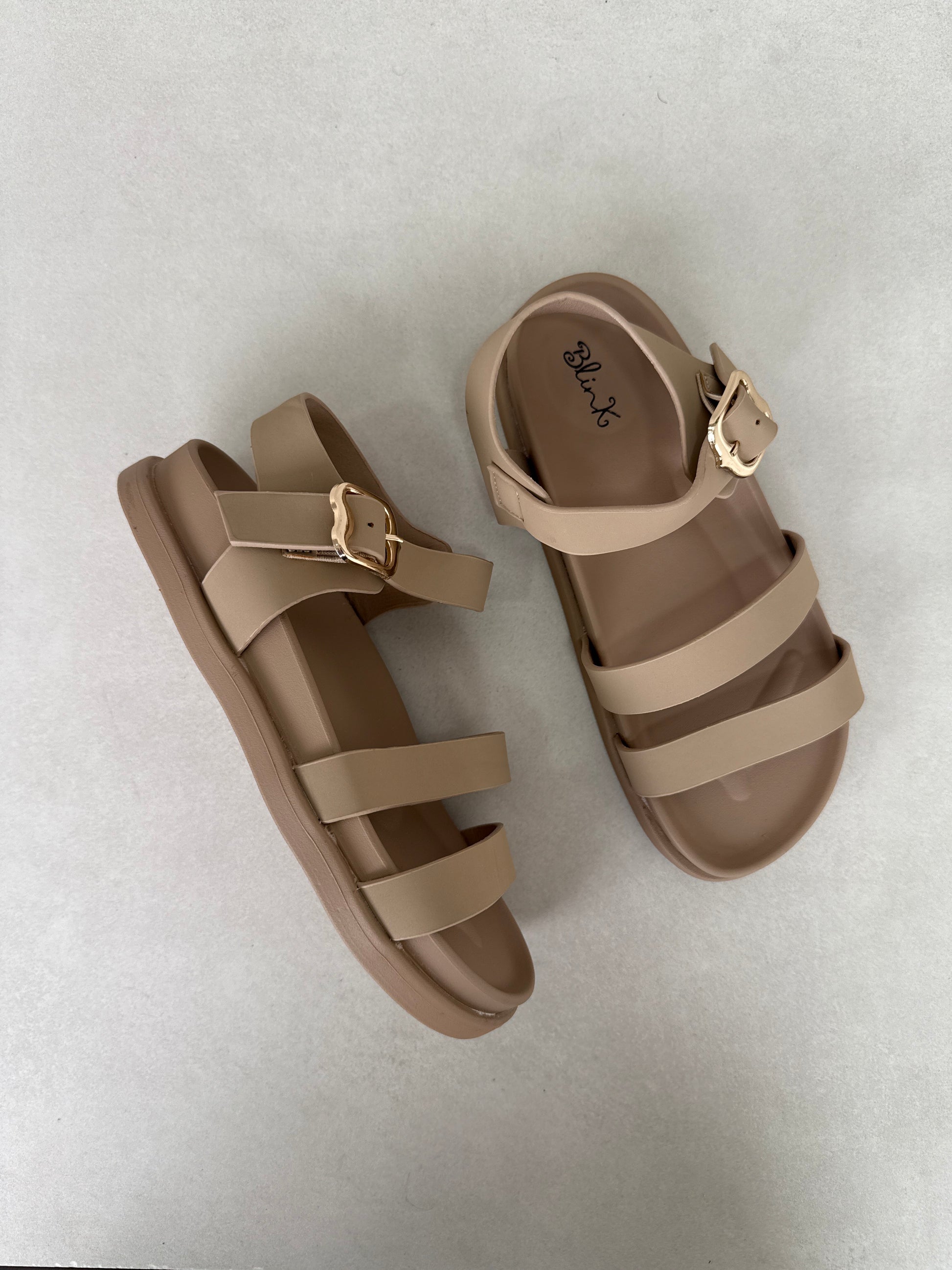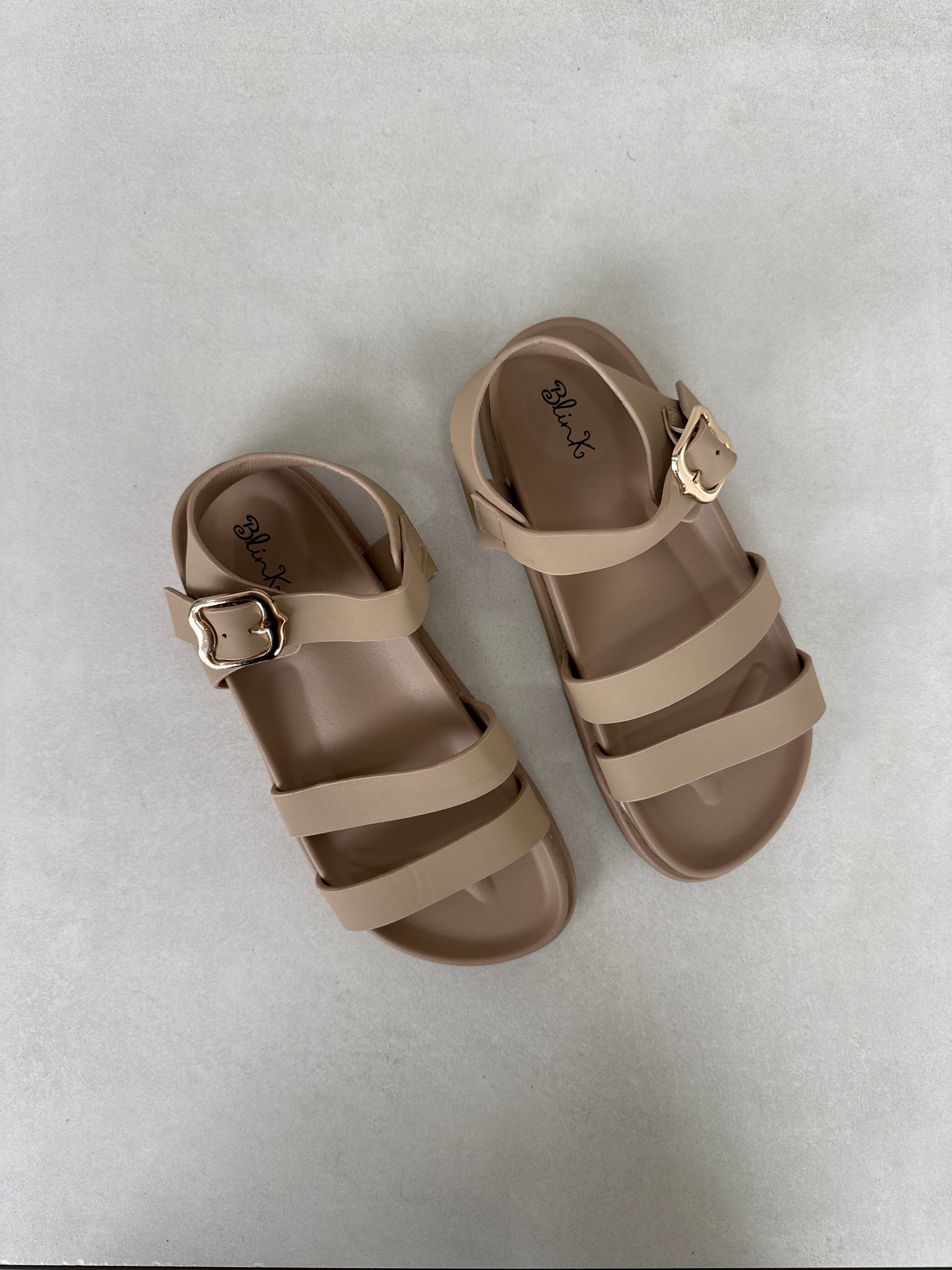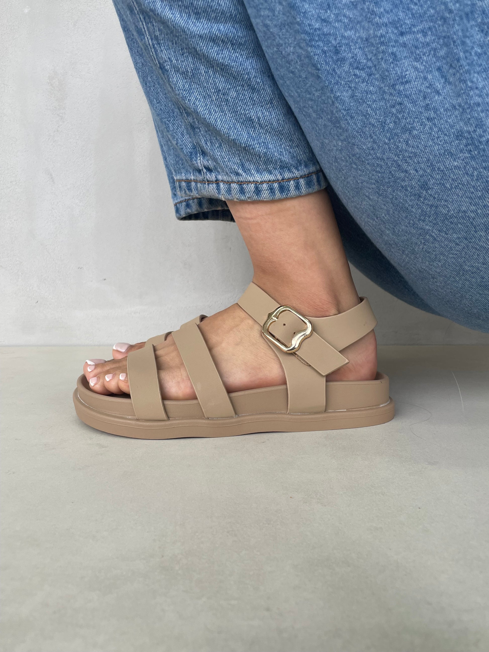 Sandalias Beige con Hebilla Dorada y Tiras Delgadas