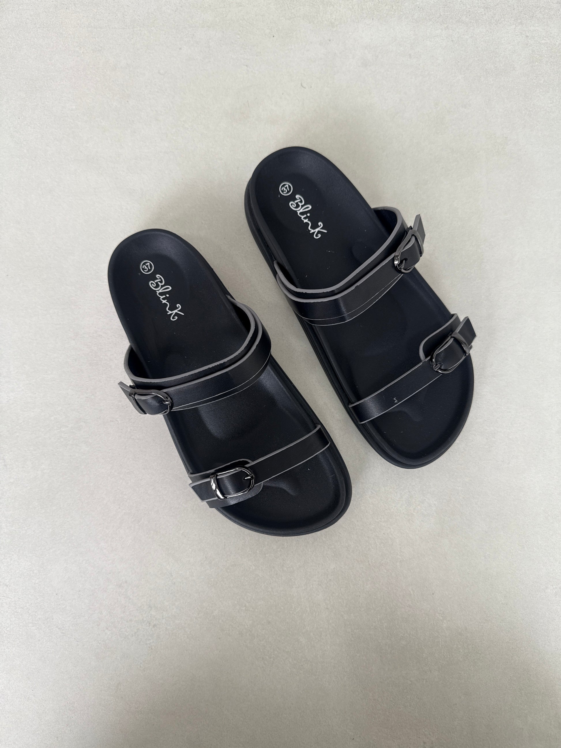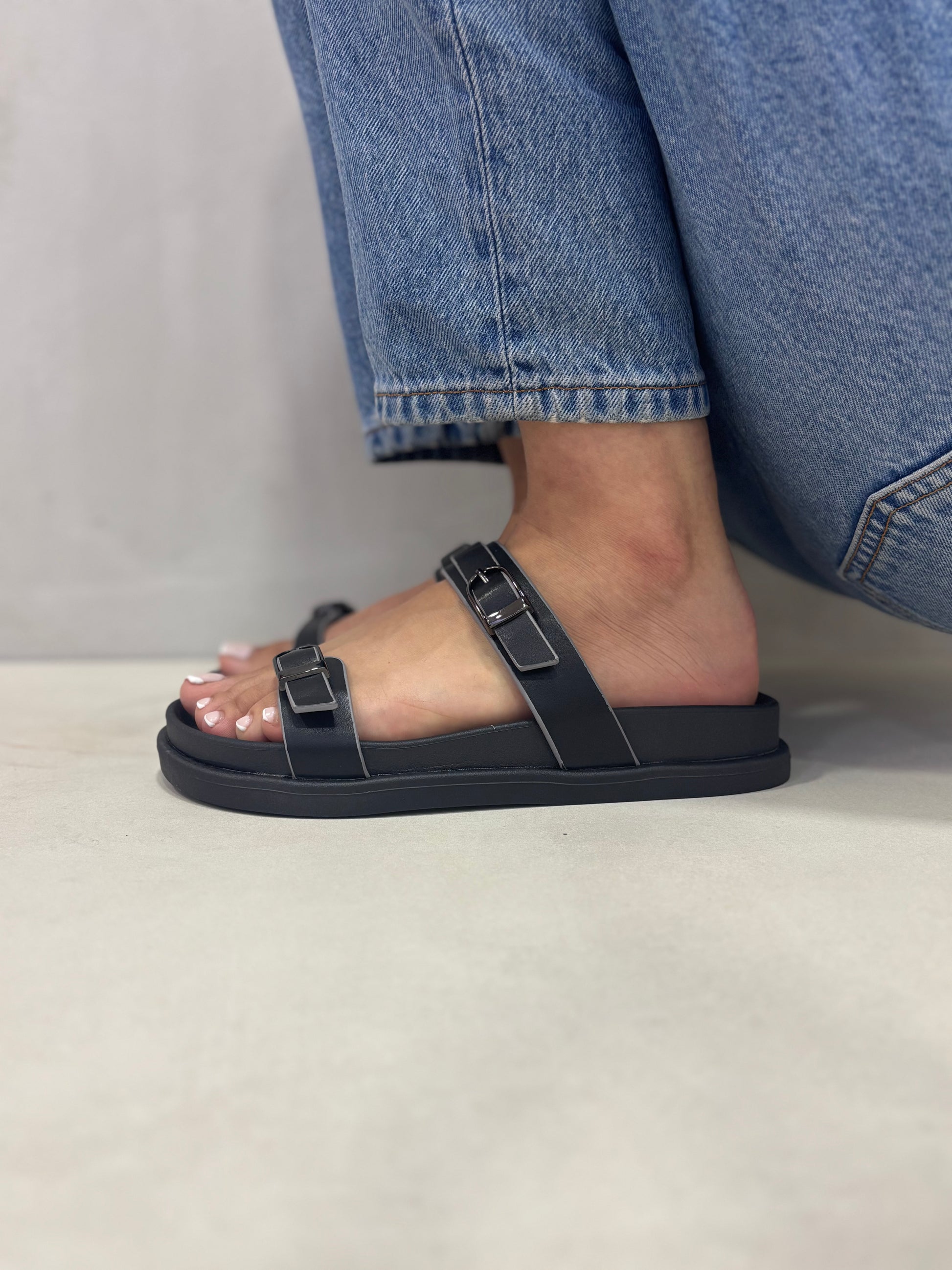 Estas sandalias negras con doble hebilla metálica ofrecen una combinación perfecta de comodidad y diseño moderno. Su suela ergonómica brinda soporte al arco y amortiguación en cada paso, mientras su acabado mate aporta un toque sobrio y elegante. Perfectas para quienes buscan un calzado versátil, ideal para el uso diario o para complementar un look casual contemporáneo.