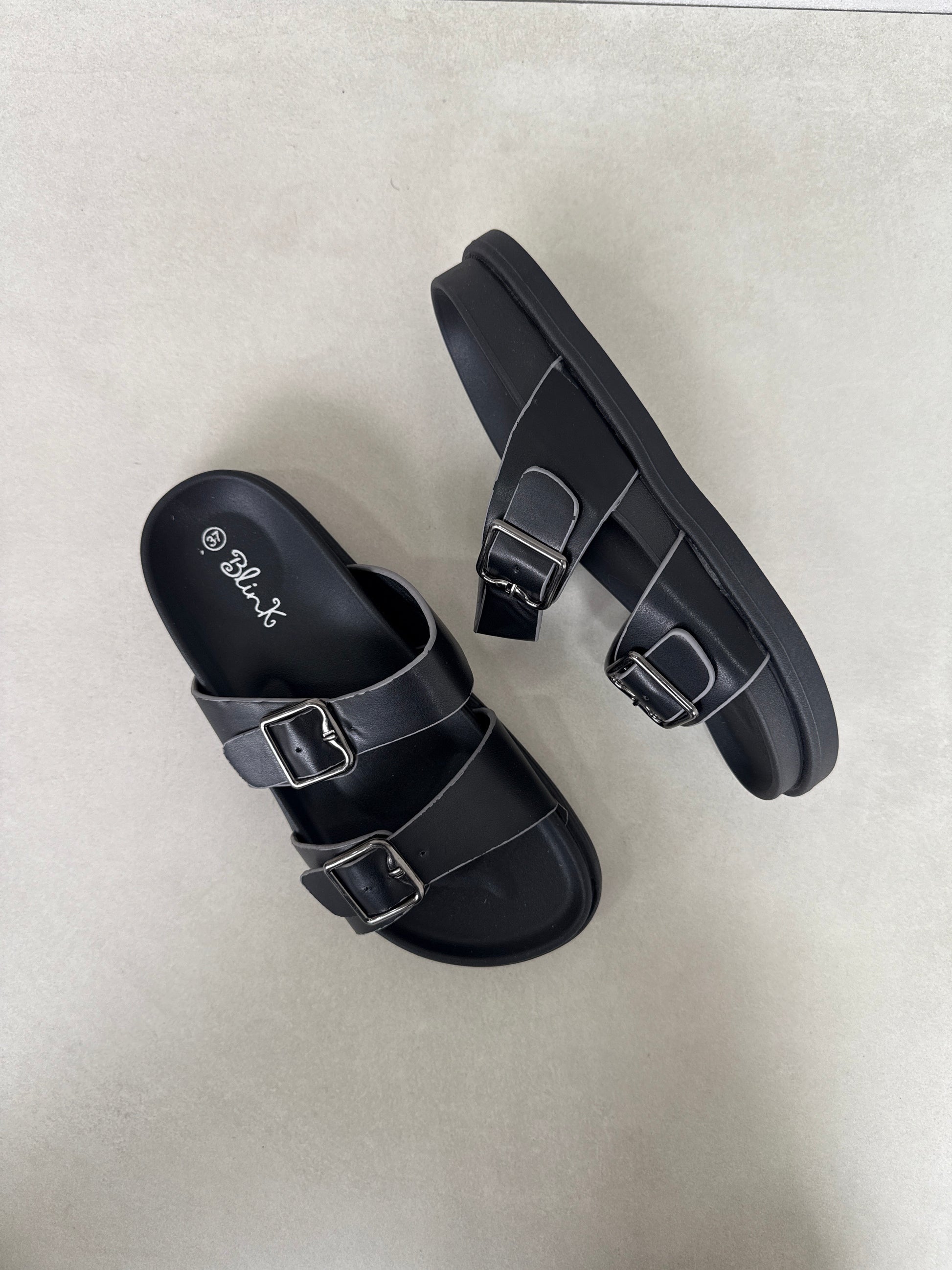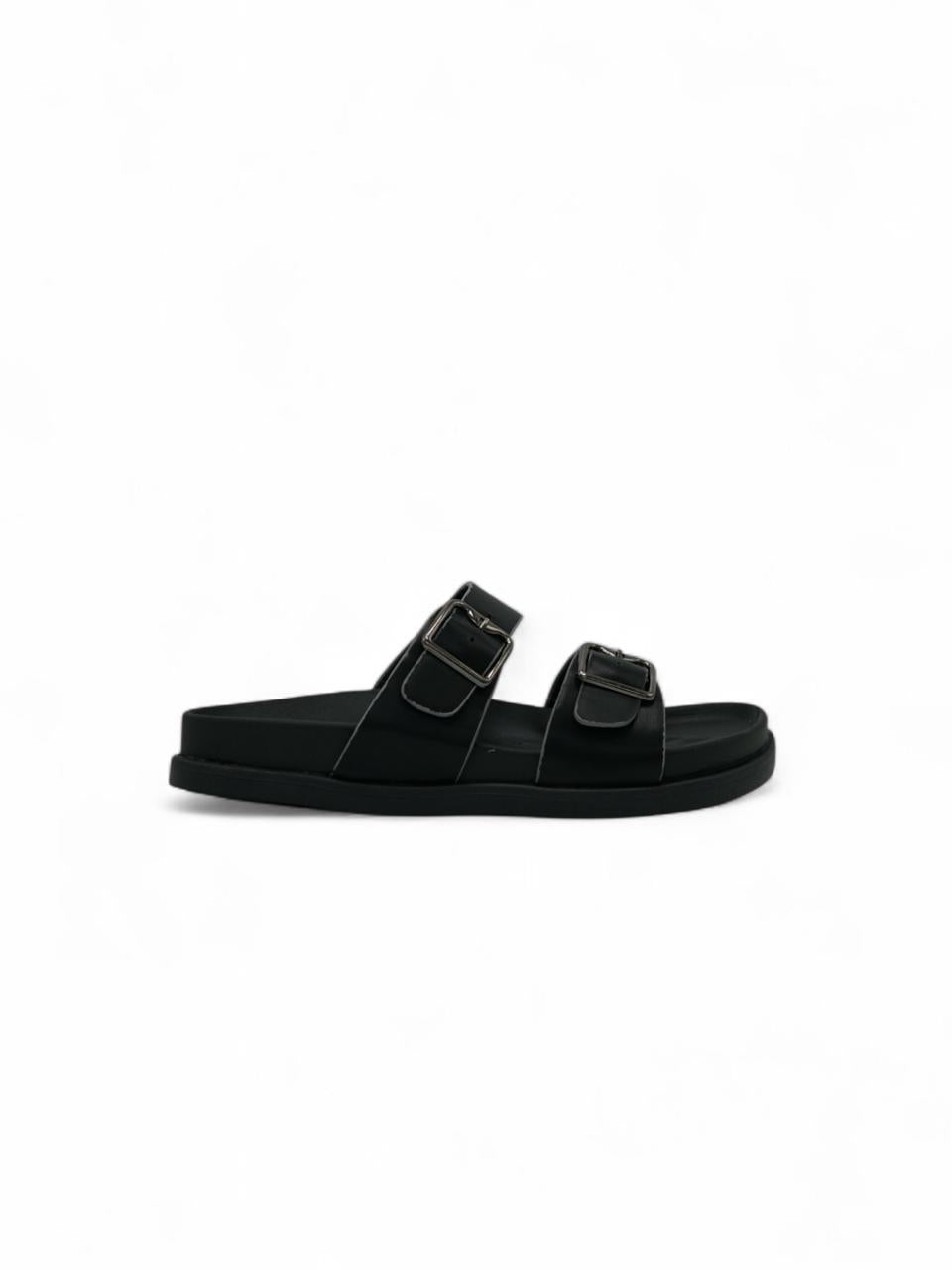 Estas sandalias negras de doble correa con hebillas metálicas son el equilibrio perfecto entre simplicidad y elegancia. Su diseño limpio y su plantilla ergonómica las hacen ideales para el uso diario, aportando confort y estilo a cualquier look. Perfectas para combinar con jeans, shorts o vestidos casuales.