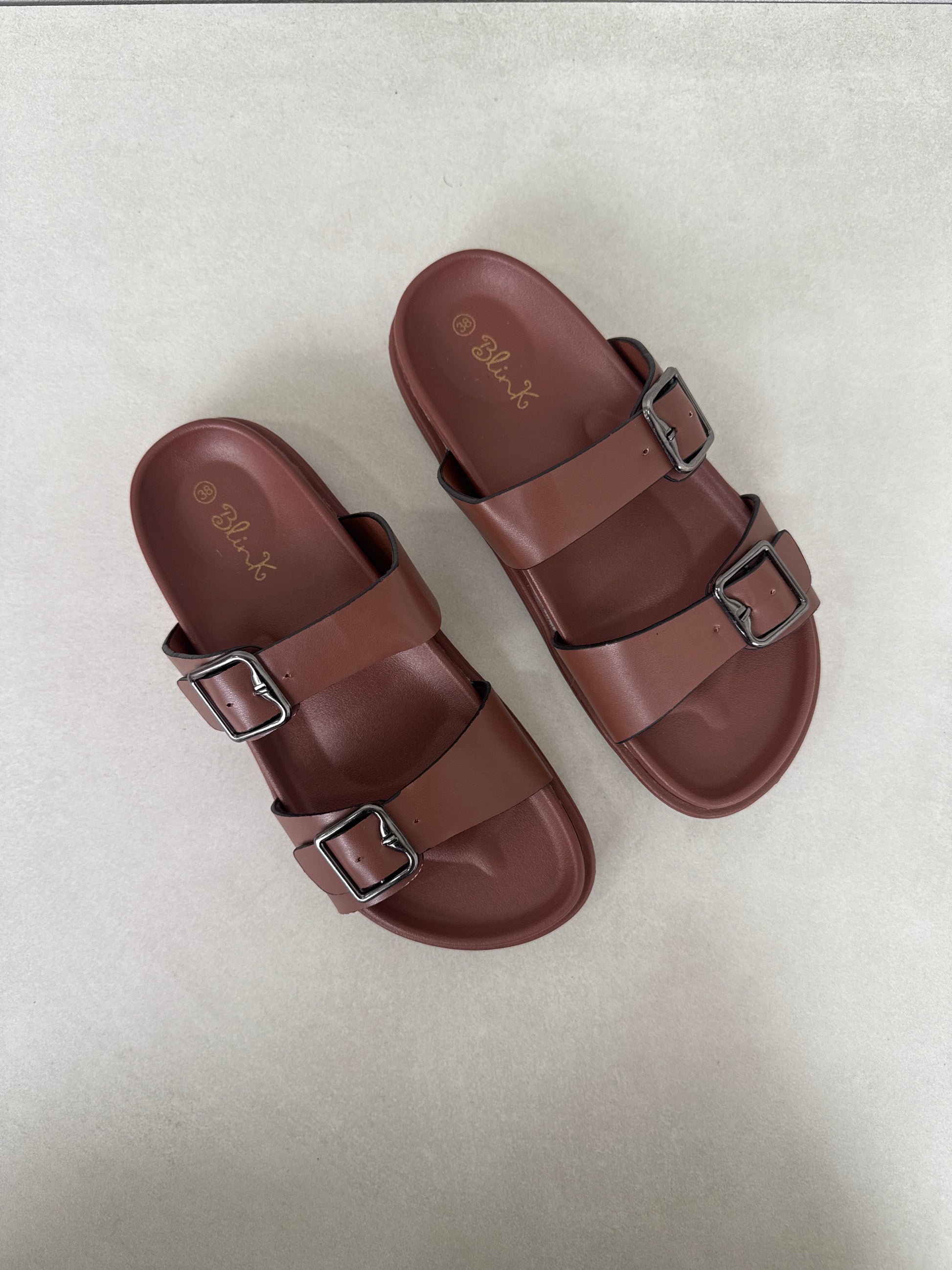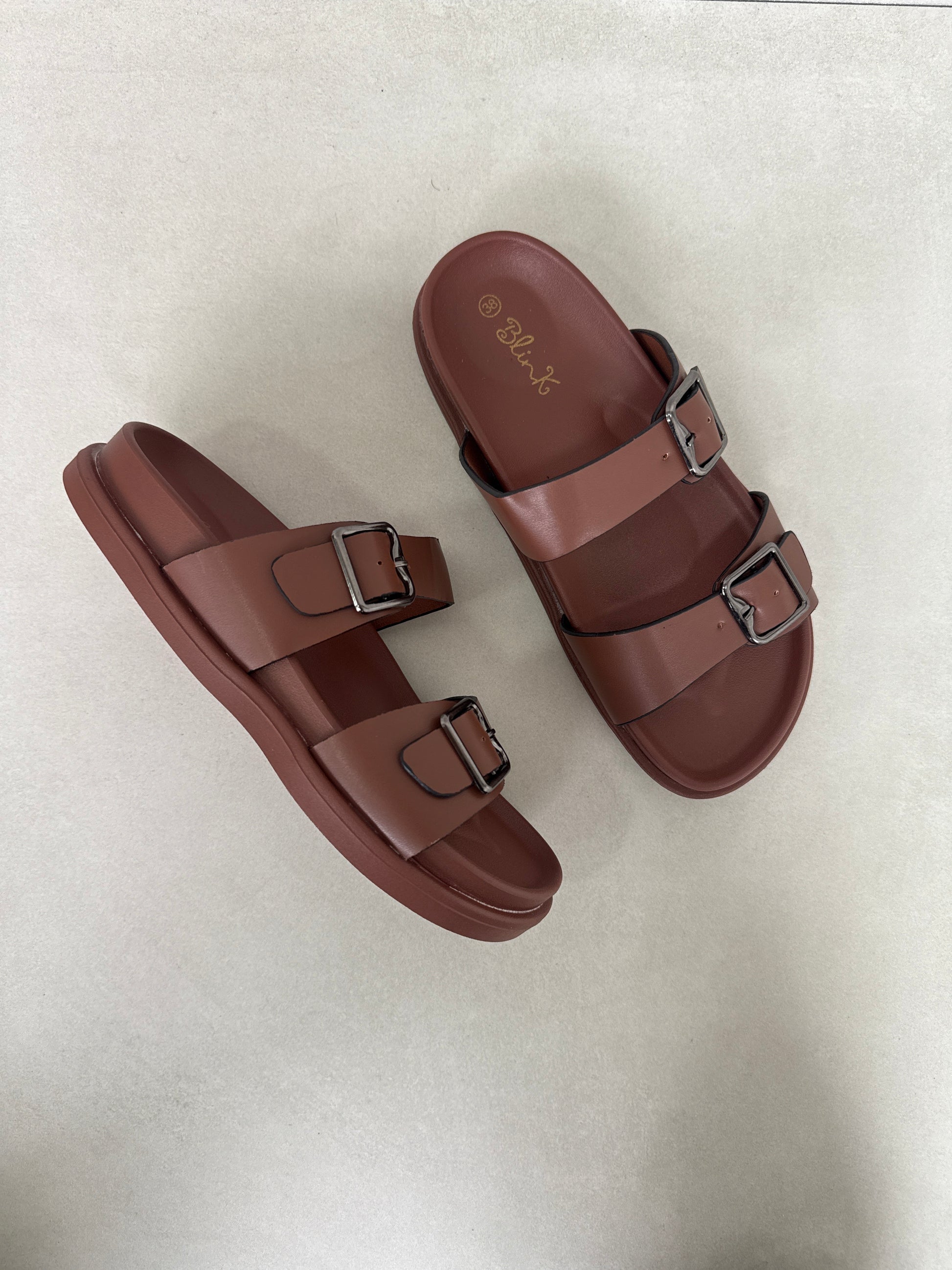 Estas sandalias color marrón oscuro destacan por su diseño clásico de doble correa con hebillas metálicas, perfectas para quienes buscan un calzado versátil y moderno. Su plantilla anatómica y suela ligera brindan comodidad en cada paso, ideales para combinar con jeans, vestidos o looks relajados.