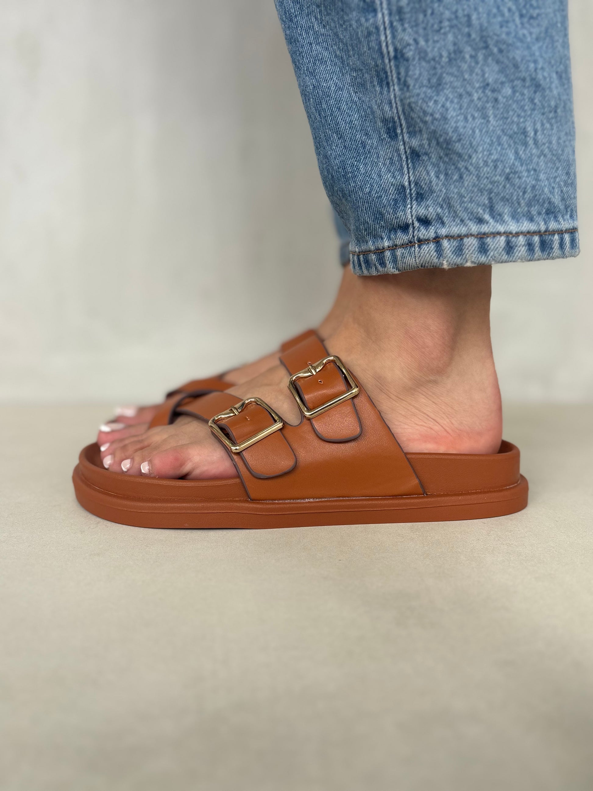 Estas sandalias color camel con doble hebilla dorada combinan estilo, ligereza y confort en un diseño moderno y funcional. Su suela ergonómica proporciona soporte y estabilidad, mientras su acabado mate aporta un toque cálido y natural que combina fácilmente con cualquier outfit. Ideales para el uso diario, paseos o momentos de descanso con un estilo casual sofisticado.
