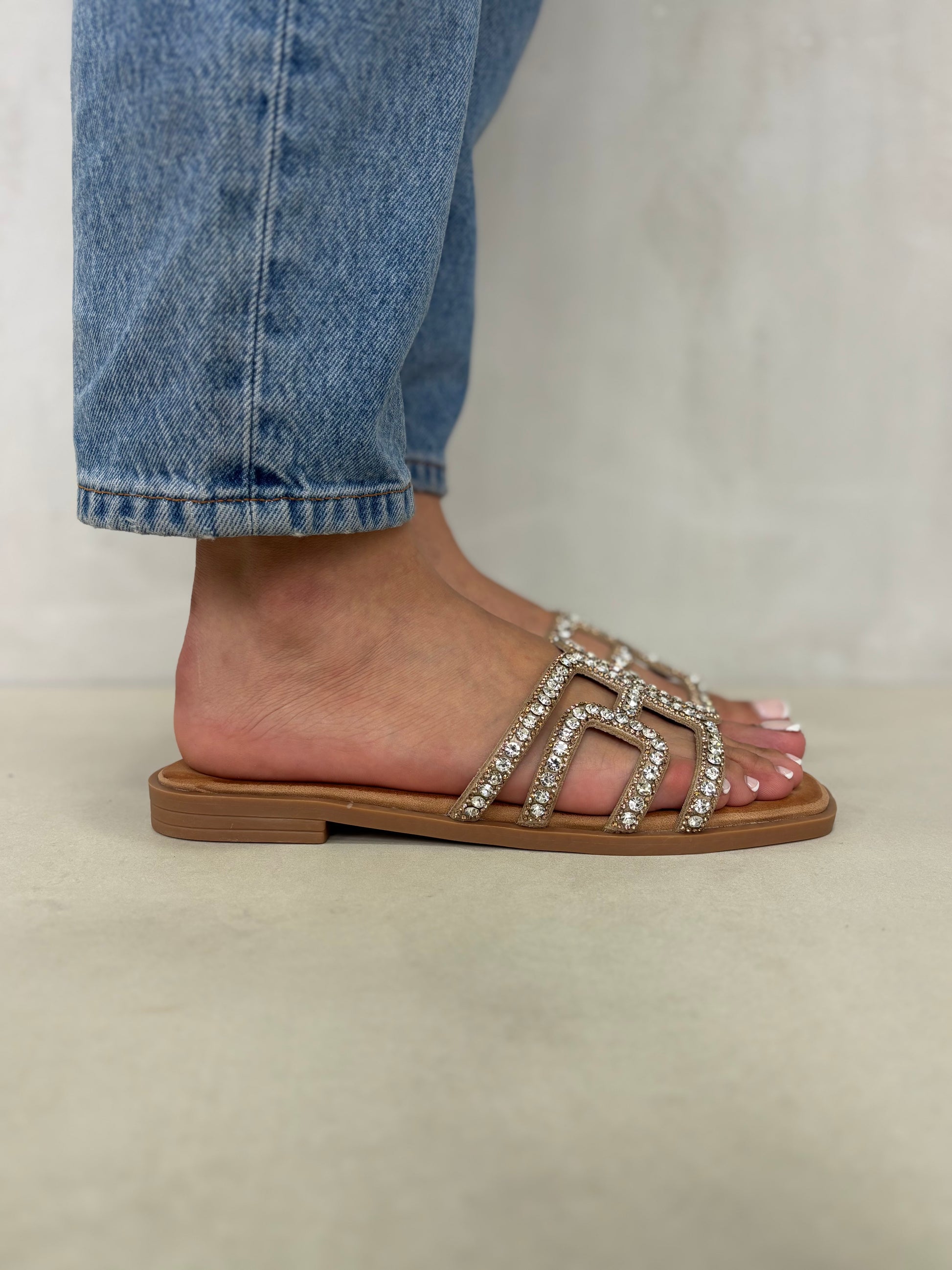 Sandalias Beige con Aplique de Brillos y Suela Plana