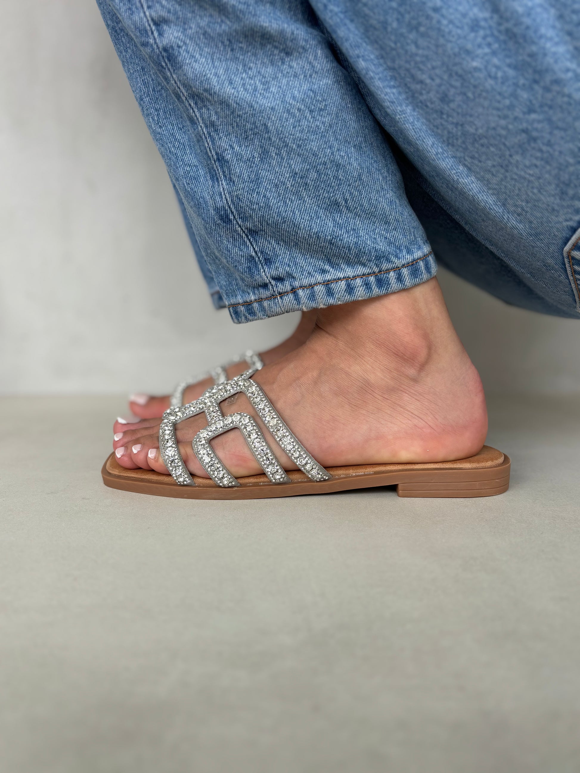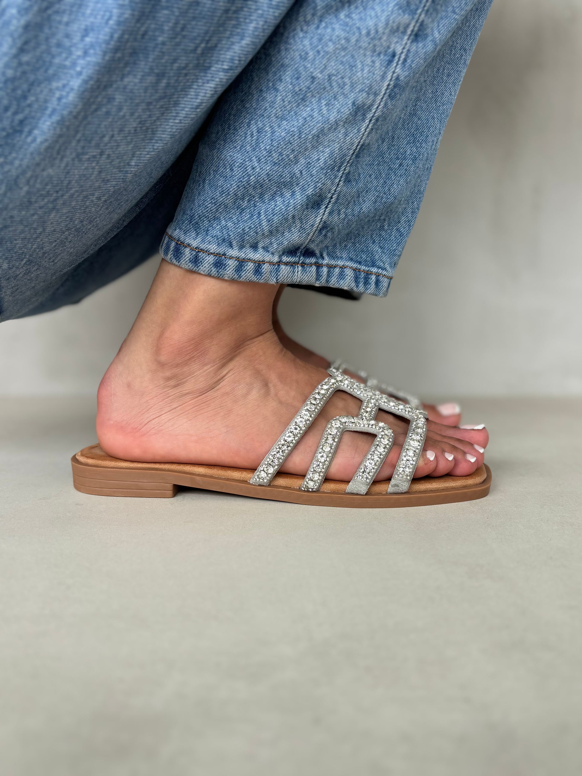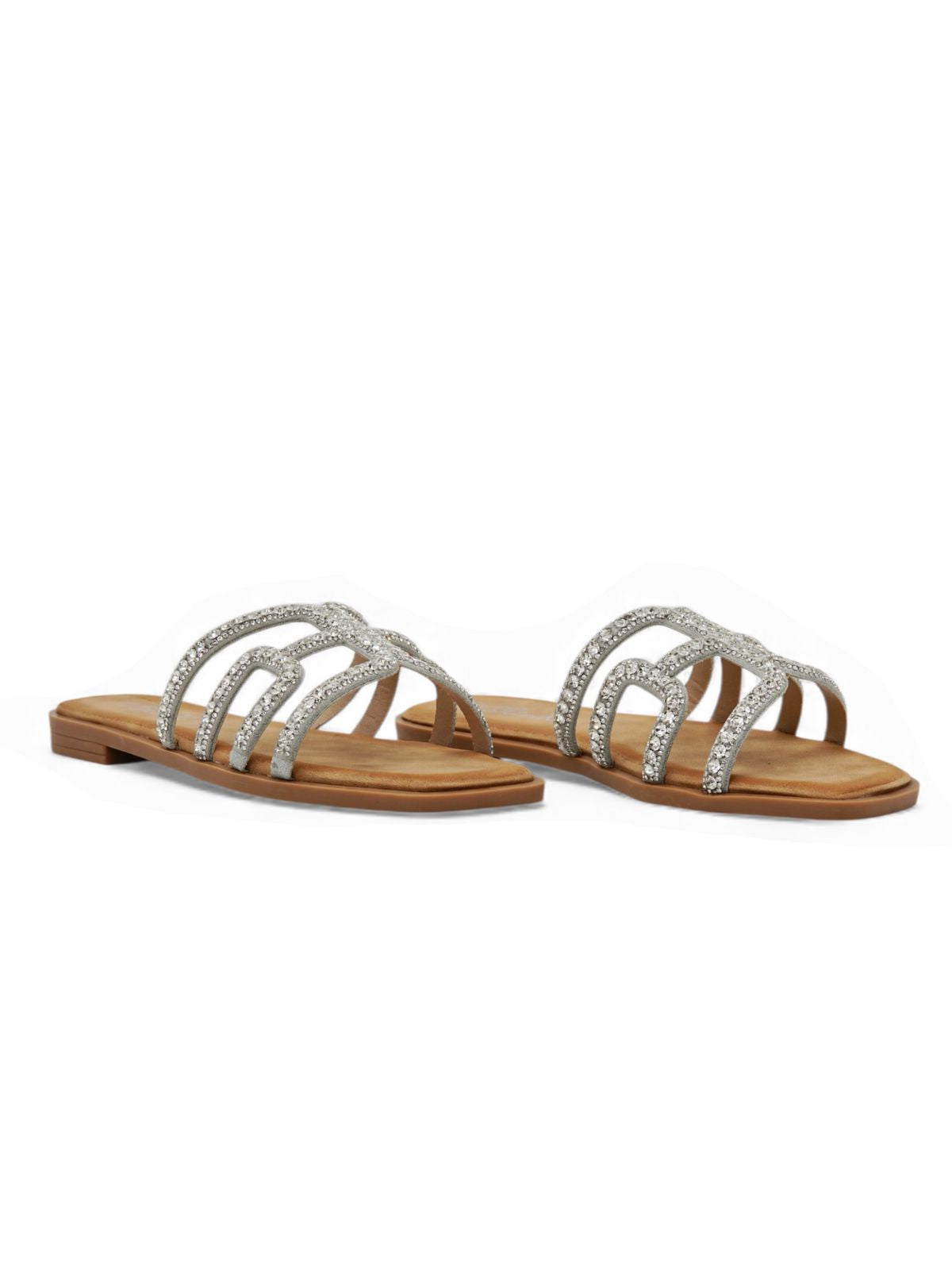 Estas sandalias plateadas con incrustaciones de brillo destacan por su diseño sofisticado y femenino. Su estructura abierta y suela plana ofrecen equilibrio entre estilo y comodidad, convirtiéndolas en el calzado ideal para eventos especiales, salidas nocturnas o para dar un toque elegante a tus outfits casuales. Cada detalle resalta con destellos que capturan la luz, aportando una presencia moderna y chic.