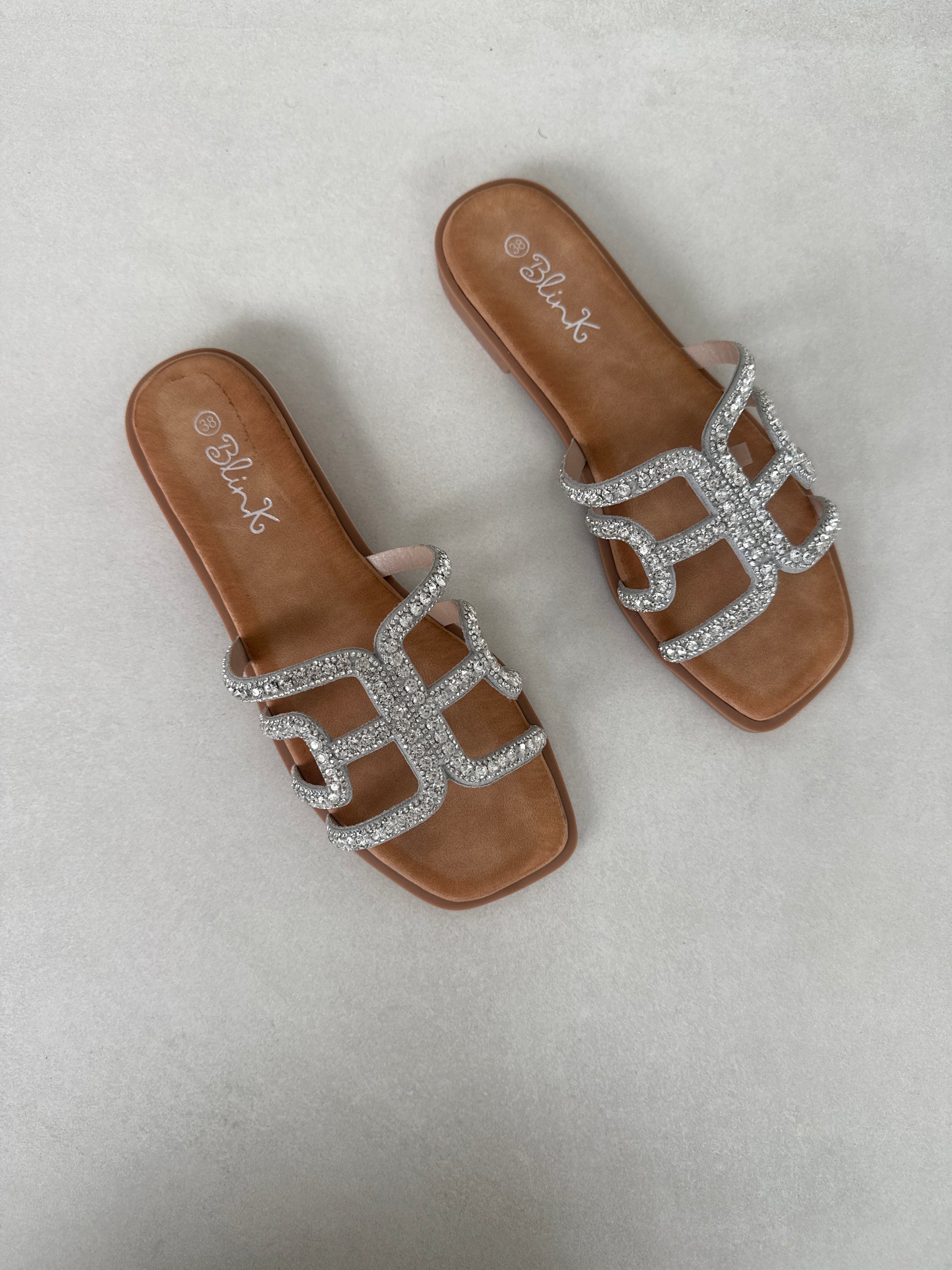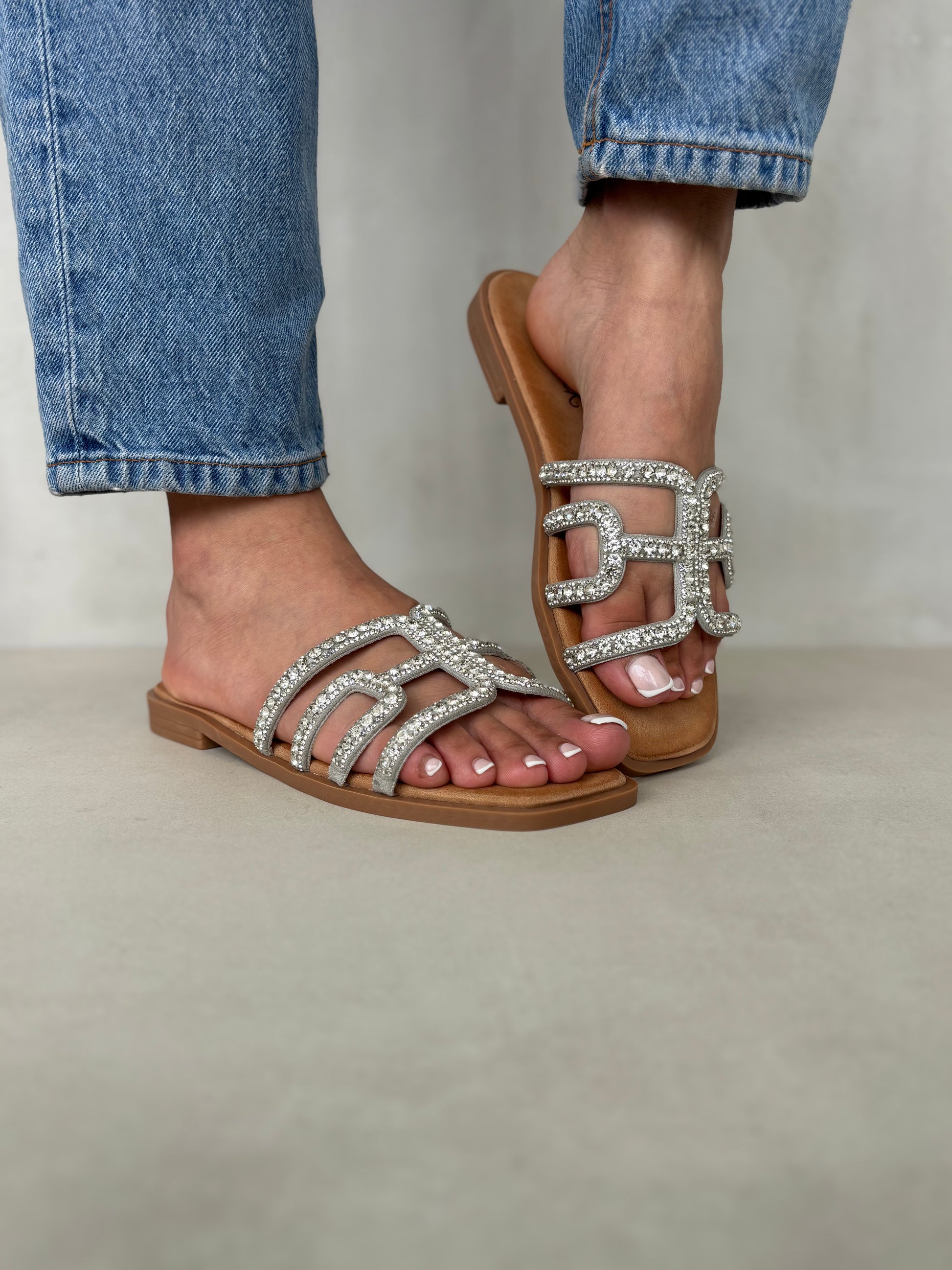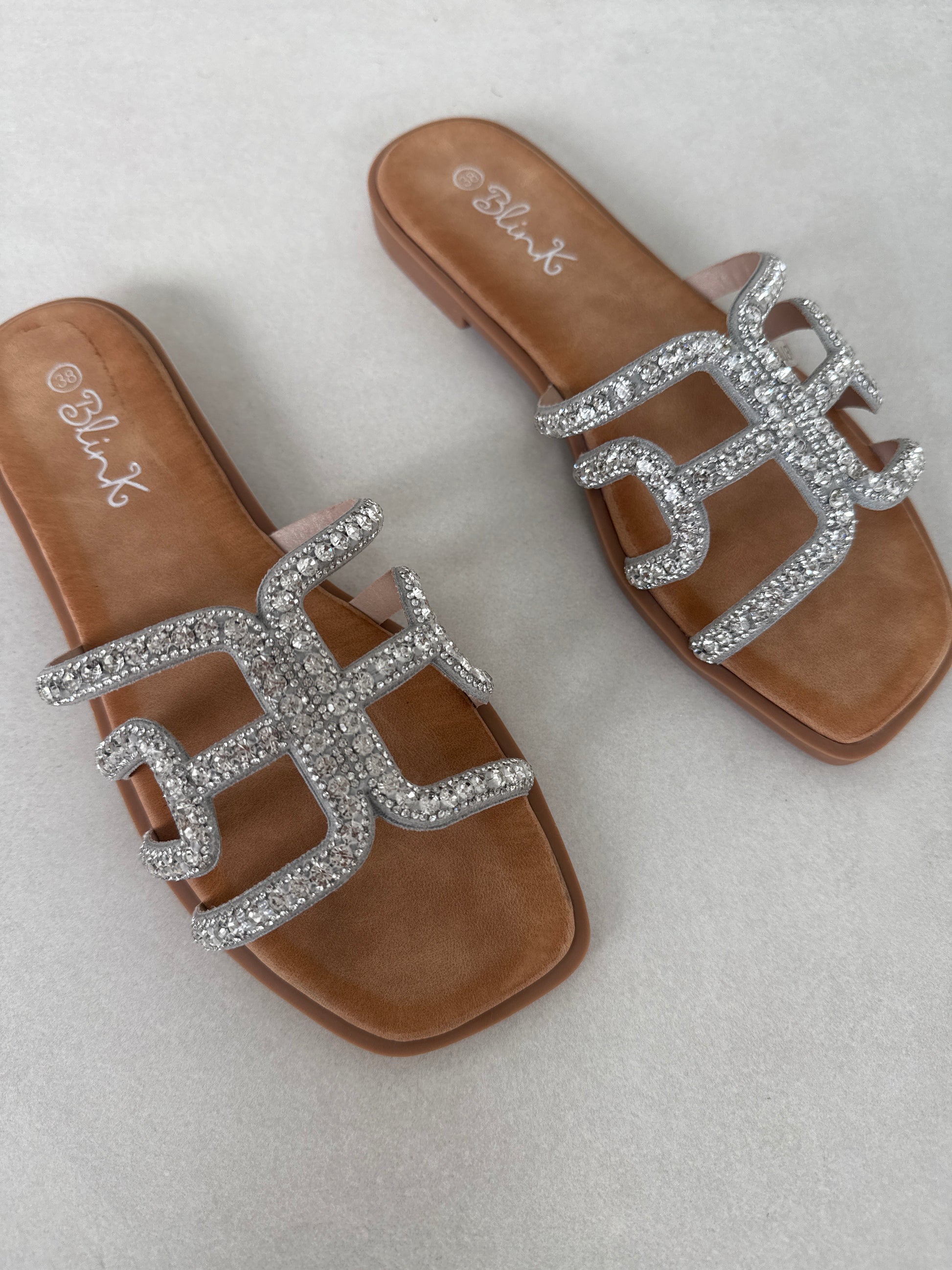 Estas sandalias plateadas con incrustaciones de brillo destacan por su diseño sofisticado y femenino. Su estructura abierta y suela plana ofrecen equilibrio entre estilo y comodidad, convirtiéndolas en el calzado ideal para eventos especiales, salidas nocturnas o para dar un toque elegante a tus outfits casuales. Cada detalle resalta con destellos que capturan la luz, aportando una presencia moderna y chic.