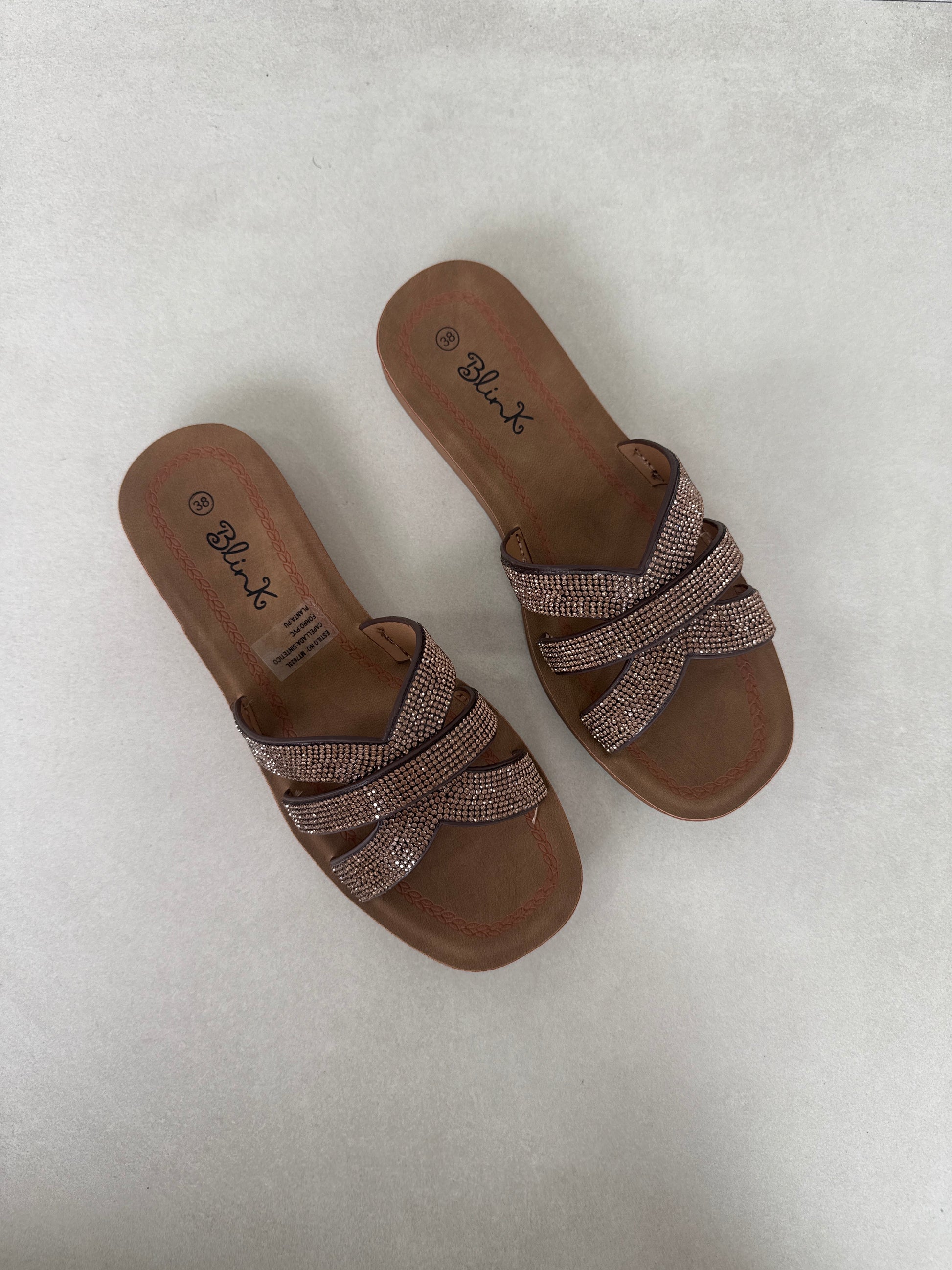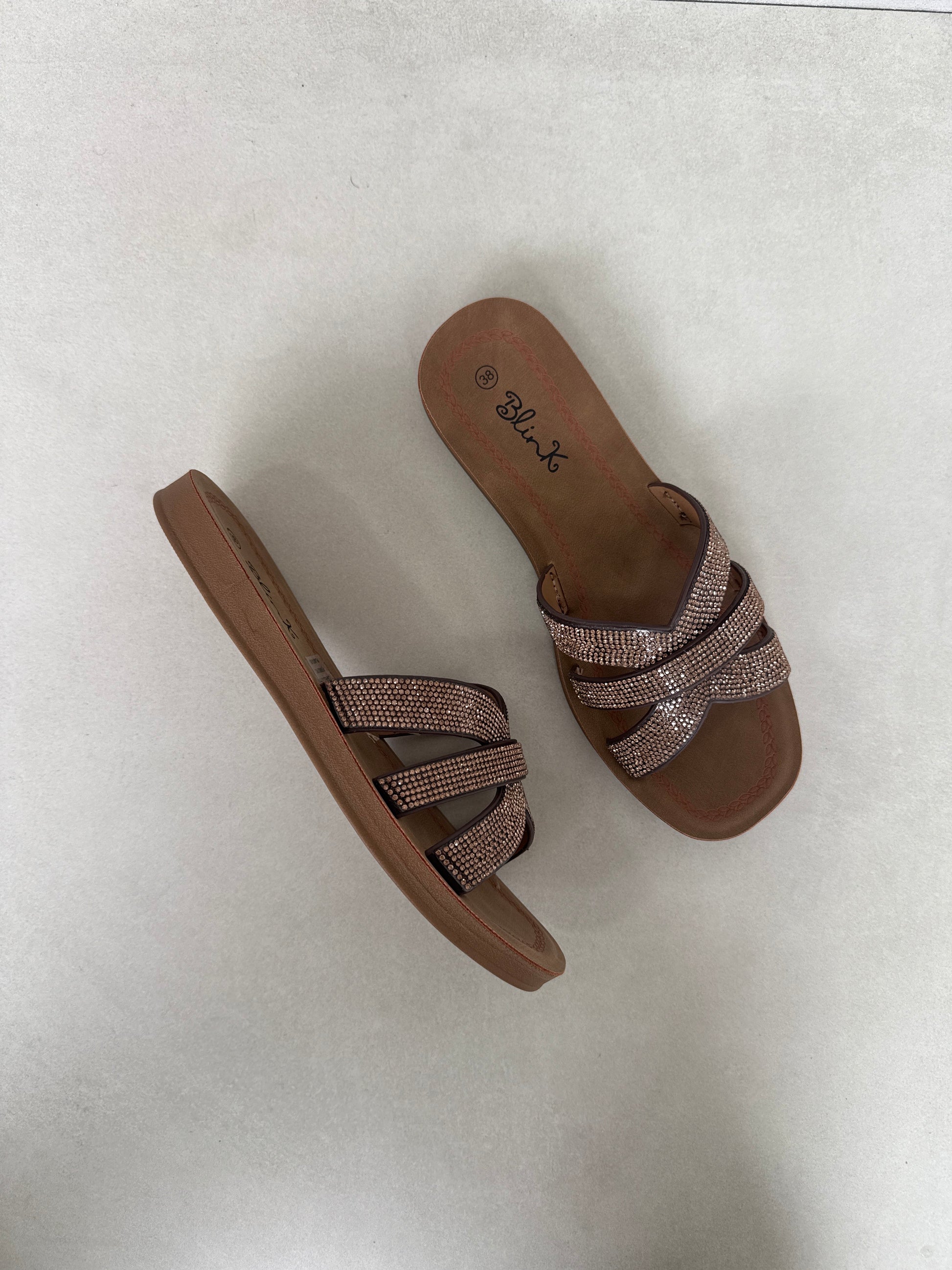 Estas sandalias marrones con tiras cruzadas decoradas en brillo aportan un toque sofisticado a un diseño cómodo y versátil. Ideales para los días cálidos, ofrecen una sensación ligera y una apariencia refinada que combina con cualquier atuendo casual o veraniego.