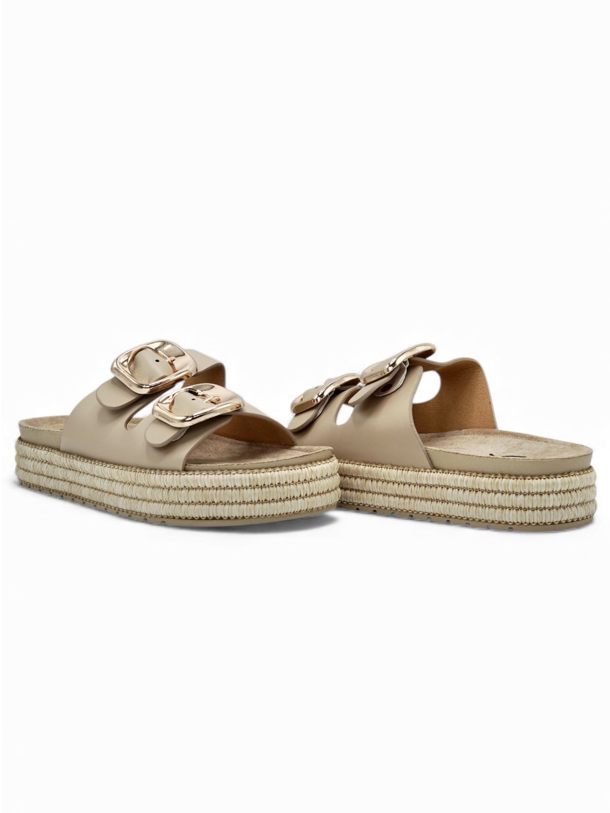 Estas sandalias beige con doble hebilla combinan comodidad y estilo moderno en un diseño perfecto para el día a día. Su plataforma forrada en yute aporta un toque natural y fresco, mientras las correas suaves aseguran un calce firme y confortable. Son ideales para looks relajados, casuales o de verano, manteniendo una estética moderna sin sacrificar comodidad.