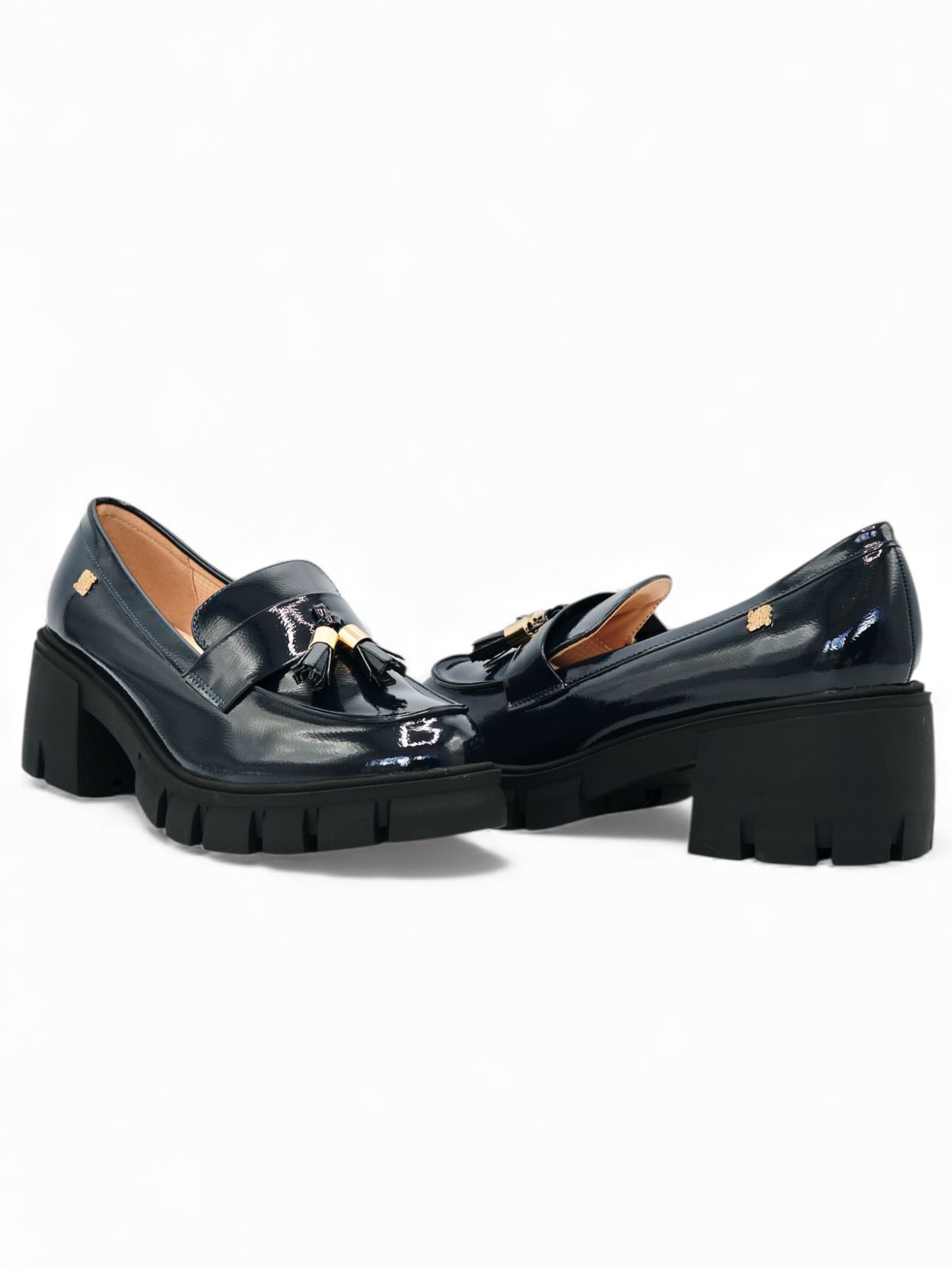Estos mocasines azul charol combinan estilo moderno con una pisada firme y cómoda. Su acabado brillante aporta un toque sofisticado, mientras la plataforma robusta añade presencia sin comprometer la estabilidad. Las borlas frontales elevan el diseño, haciéndolos ideales para outfits casuales, de oficina o looks urbanos que buscan diferenciarse con personalidad.