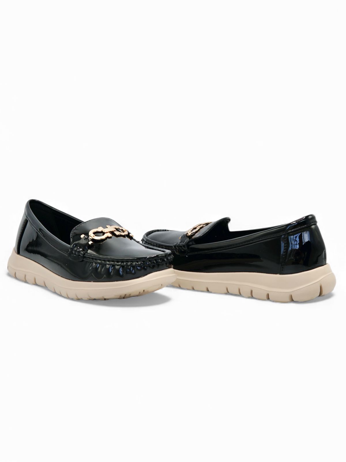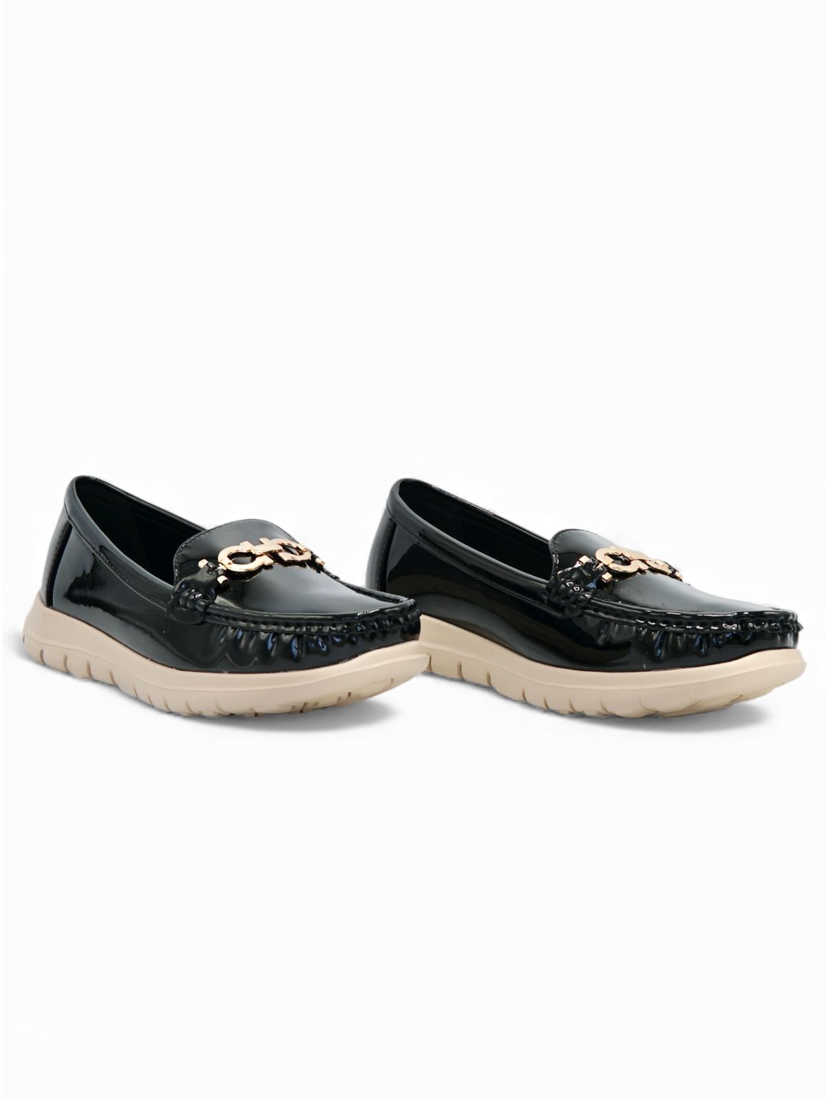 Estos mocasines negros en acabado charol combinan elegancia moderna con comodidad absoluta para el día a día. Su diseño clásico se realza con el aplique metálico frontal, ofreciendo un estilo pulido sin esfuerzo. La suela liviana brinda soporte y suavidad en cada paso, ideal para largas jornadas sin sacrificar presencia ni estilo.