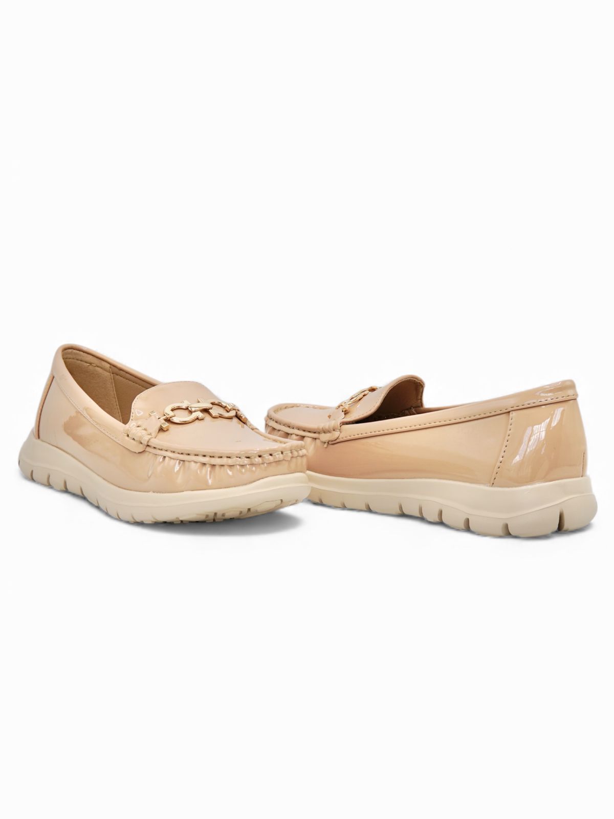 Estos mocasines beige en acabado charol ofrecen un look limpio, moderno y súper versátil para el día a día. Su diseño clásico con detalle dorado al frente añade un toque elegante sin perder practicidad. Son livianos, cómodos y perfectos para trabajar, caminar o combinar con outfits casuales y formales.