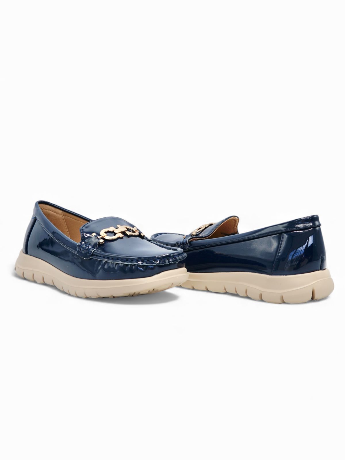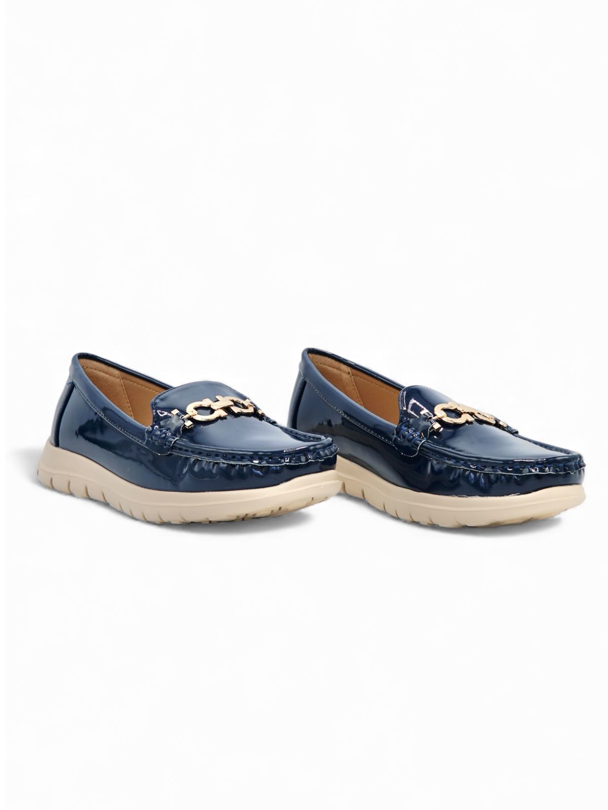 Estos mocasines en azul charol combinan estilo moderno con comodidad absoluta para el día a día. Su acabado brillante agrega un toque elegante, mientras la suela ligera y flexible los convierte en una opción ideal para trabajar, caminar o usar durante horas sin cansancio. El aplique metálico frontal aporta un detalle sofisticado que realza cualquier outfit.