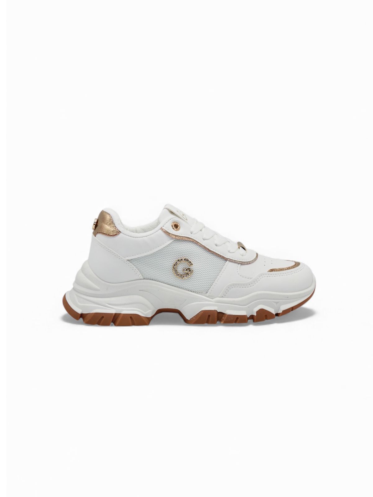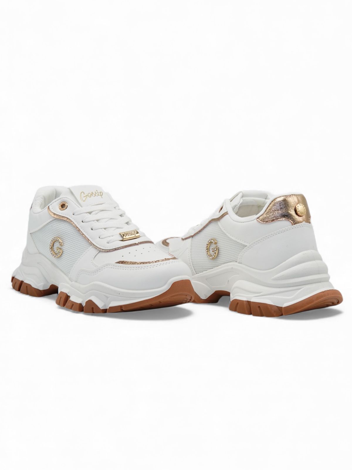 Estos tenis blancos combinan diseño moderno con comodidad diaria gracias a su suela chunky de estilo deportivo. Los detalles dorados elevan el look, aportando un toque elegante sin perder frescura. Su estructura ligera y el panel lateral en malla garantizan ventilación, convirtiéndolos en el complemento ideal para outfits casuales o athleisure.