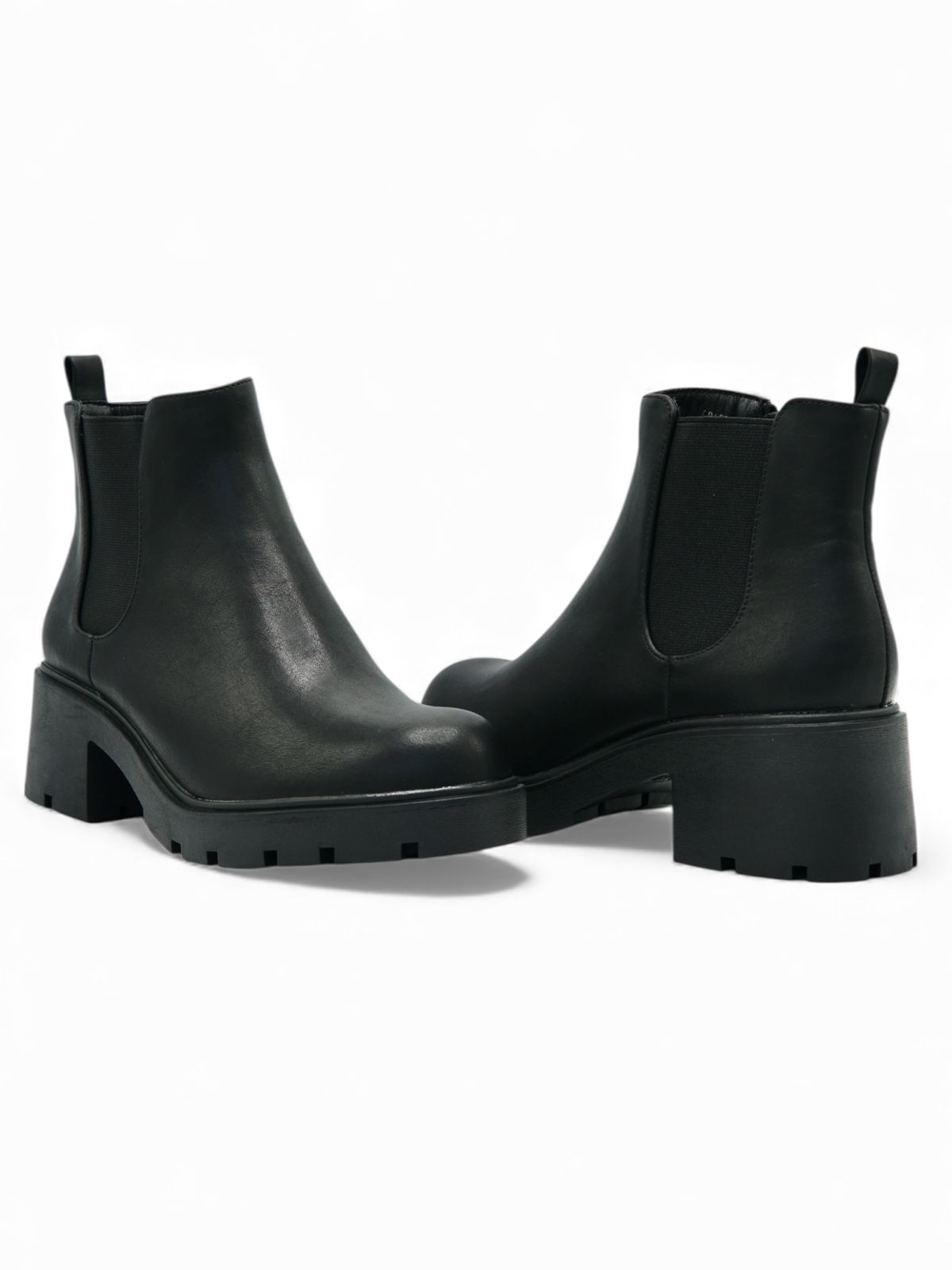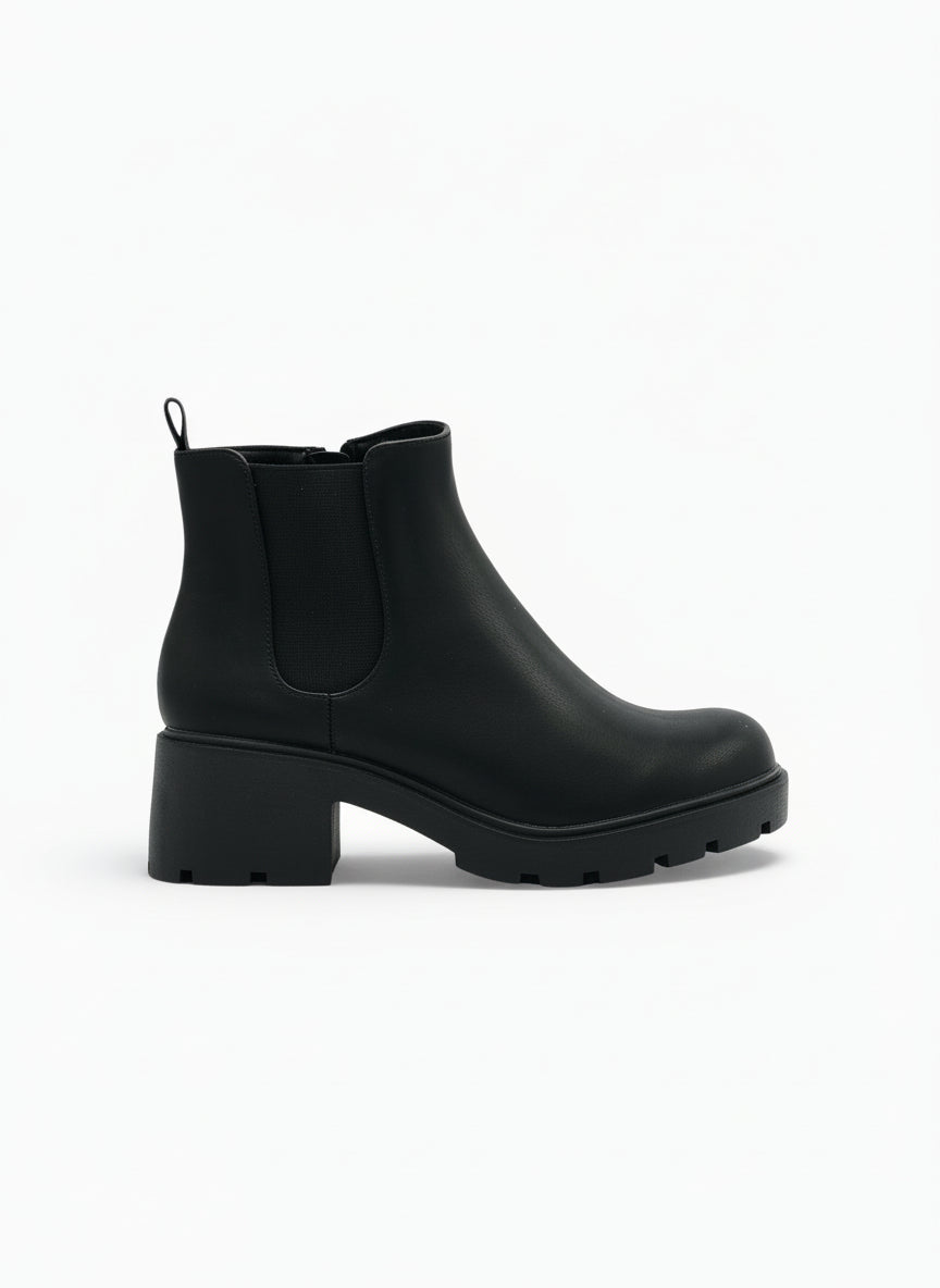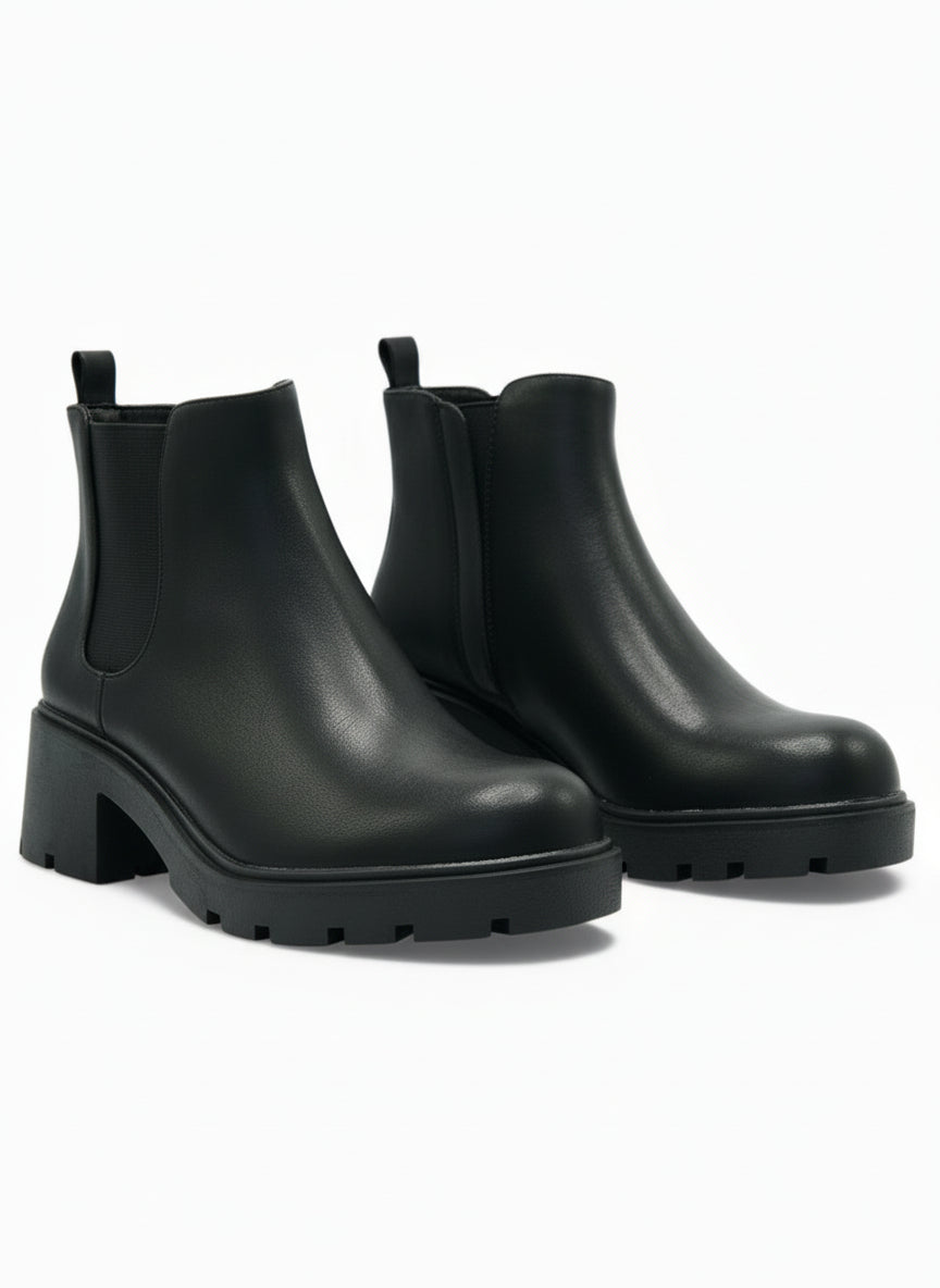 Estos botines negros son la combinación perfecta entre estilo moderno y comodidad. Su diseño minimalista con plataforma brinda altura sin sacrificar estabilidad, mientras que el panel elástico lateral facilita un ajuste práctico y firme. Son ideales para usar en el día a día, combinar con jeans, vestidos o looks más urbanos.