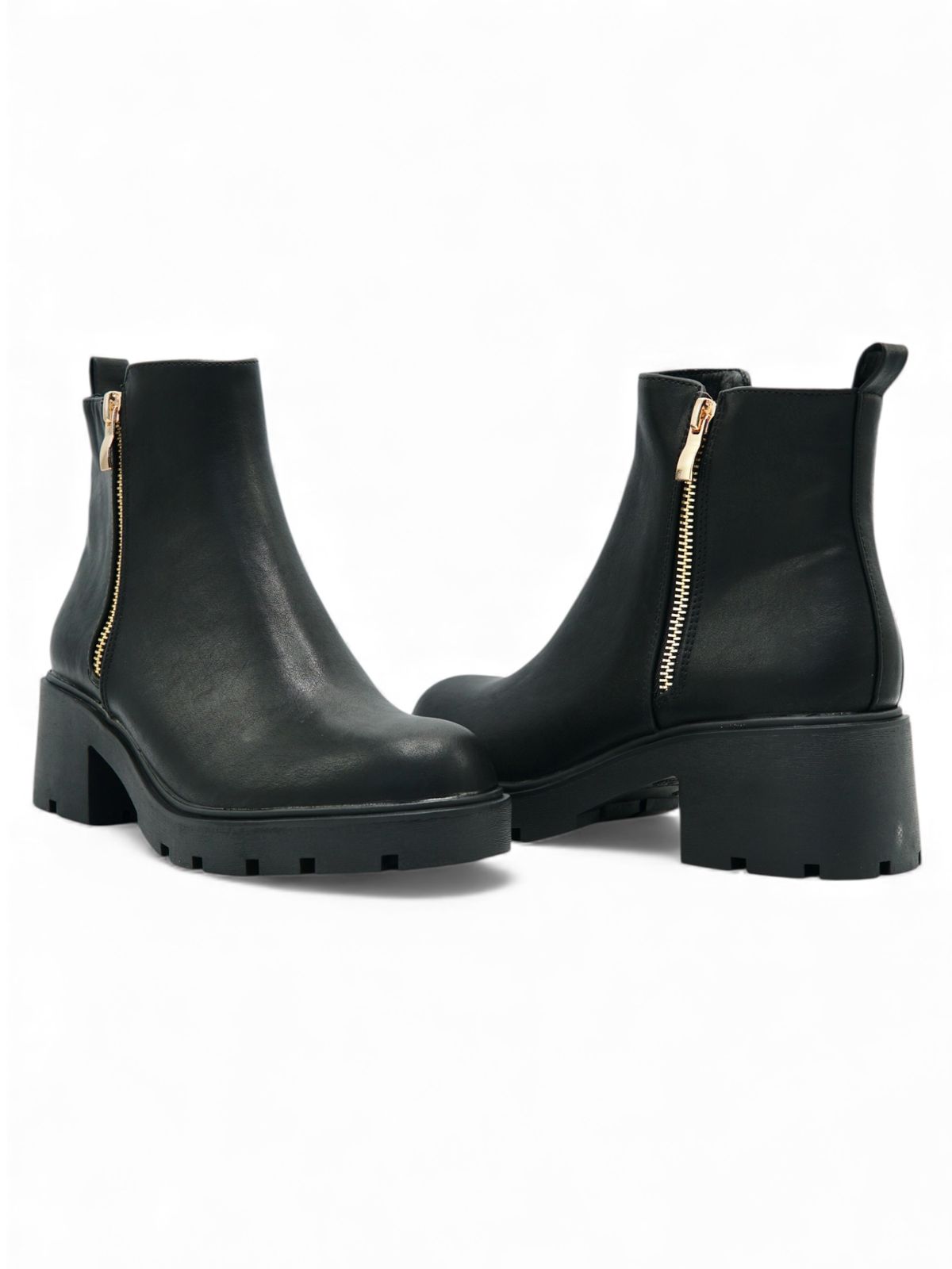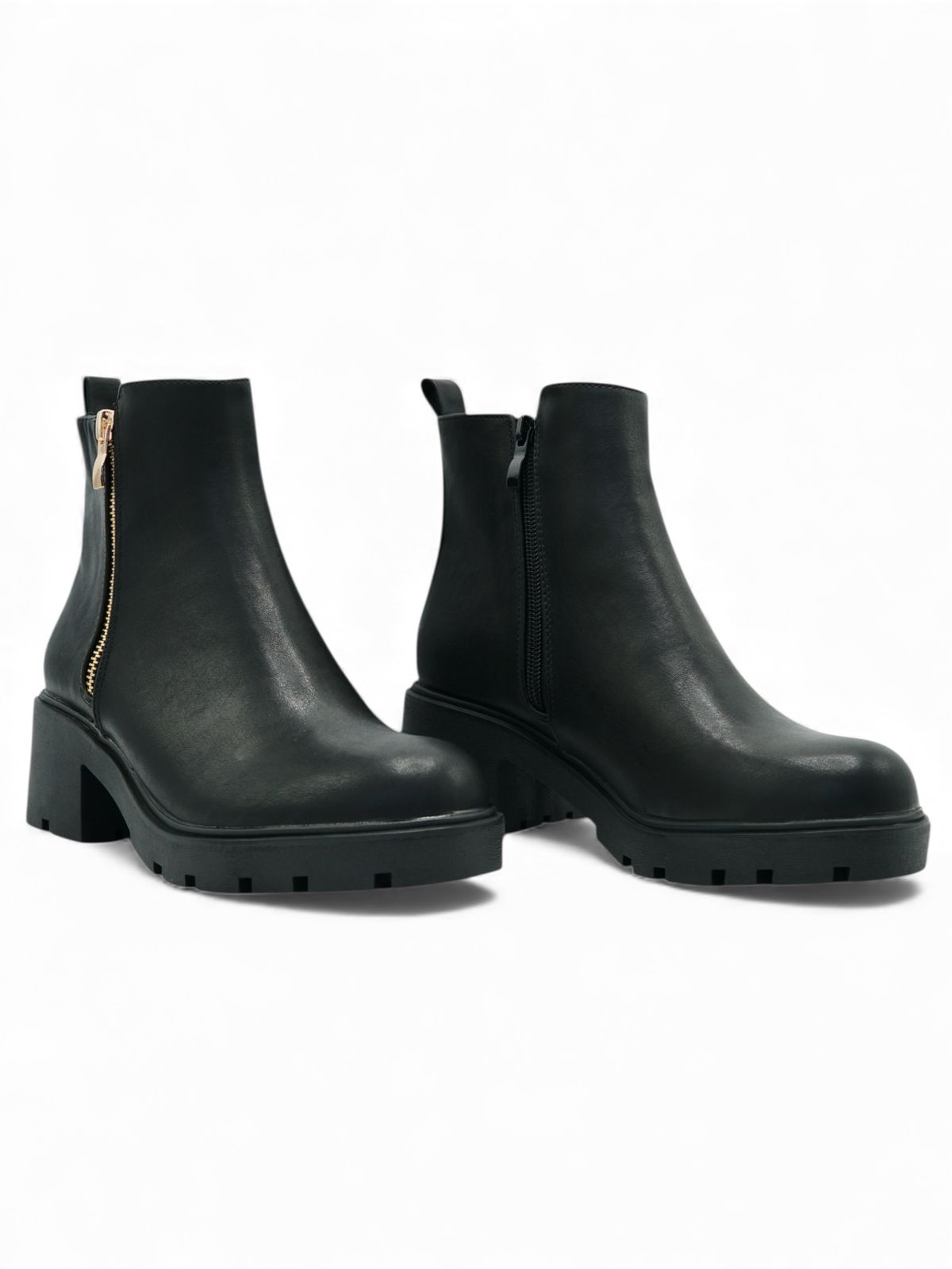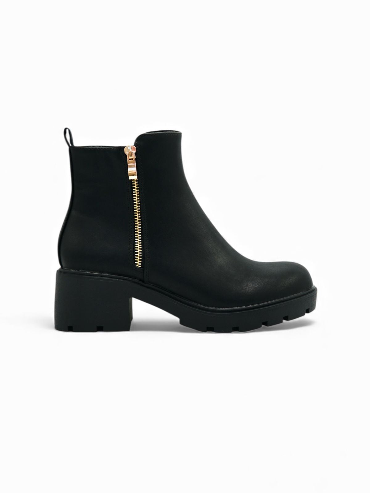 Este botín negro es una opción versátil y moderna para el día a día. Su diseño con cierre lateral dorado aporta un toque elegante, mientras que la suela chunky antideslizante ofrece estabilidad y comodidad en cada paso. Es un modelo ideal para combinar con jeans, faldas o looks casuales de temporada.