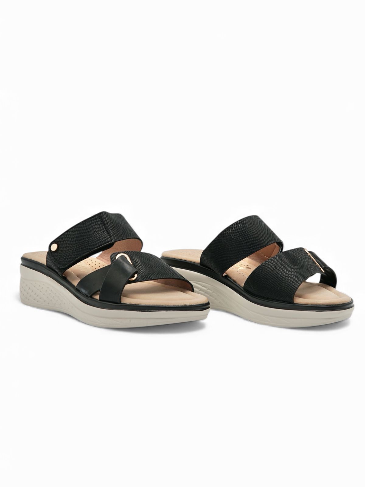 Estas sandalias negras combinan comodidad y estilo en un diseño práctico ideal para el día a día. Su plataforma ligera aporta altura sin esfuerzo, mientras las dos correas anchas brindan un ajuste seguro y estable. La plantilla acolchonada proporciona una pisada suave, perfecta para caminar largas distancias o mantenerse activa durante la jornada.