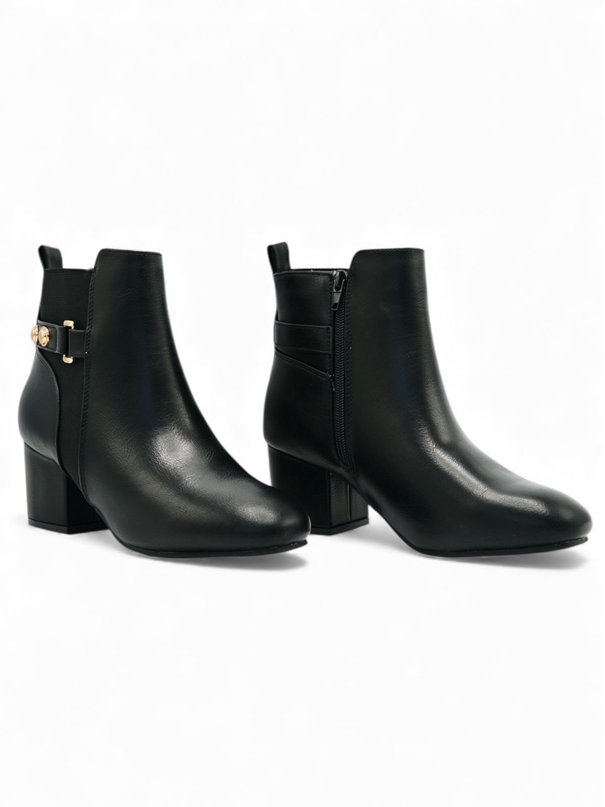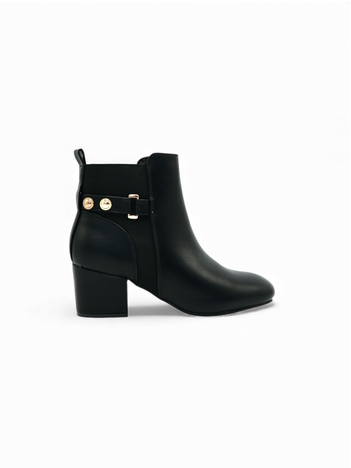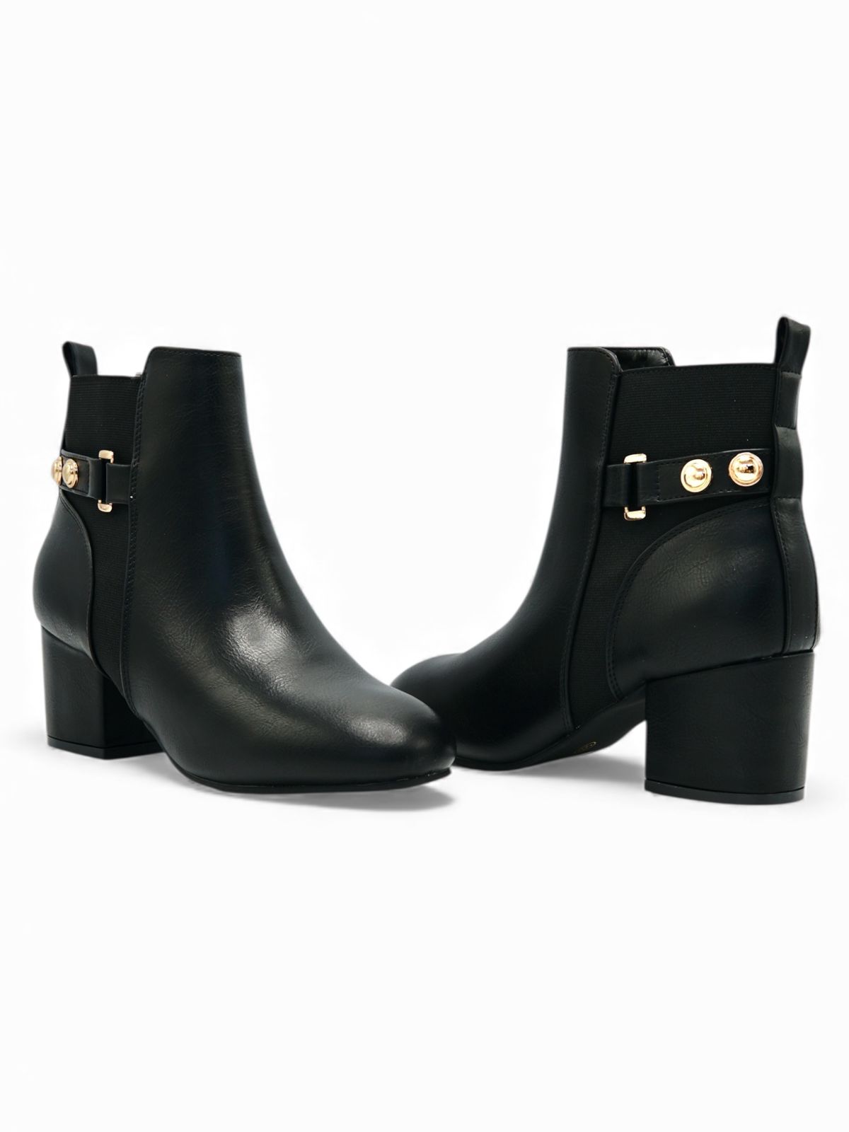 Estos botines negros combinan estilo moderno con un toque clásico, perfectos para elevar cualquier outfit del día a día. Su diseño con hebilla decorativa dorada aporta un detalle elegante, mientras que el tacón medio brinda estabilidad y comodidad. Son ideales para usar con jeans, vestidos o conjuntos más formales gracias a su versatilidad y acabado limpio.