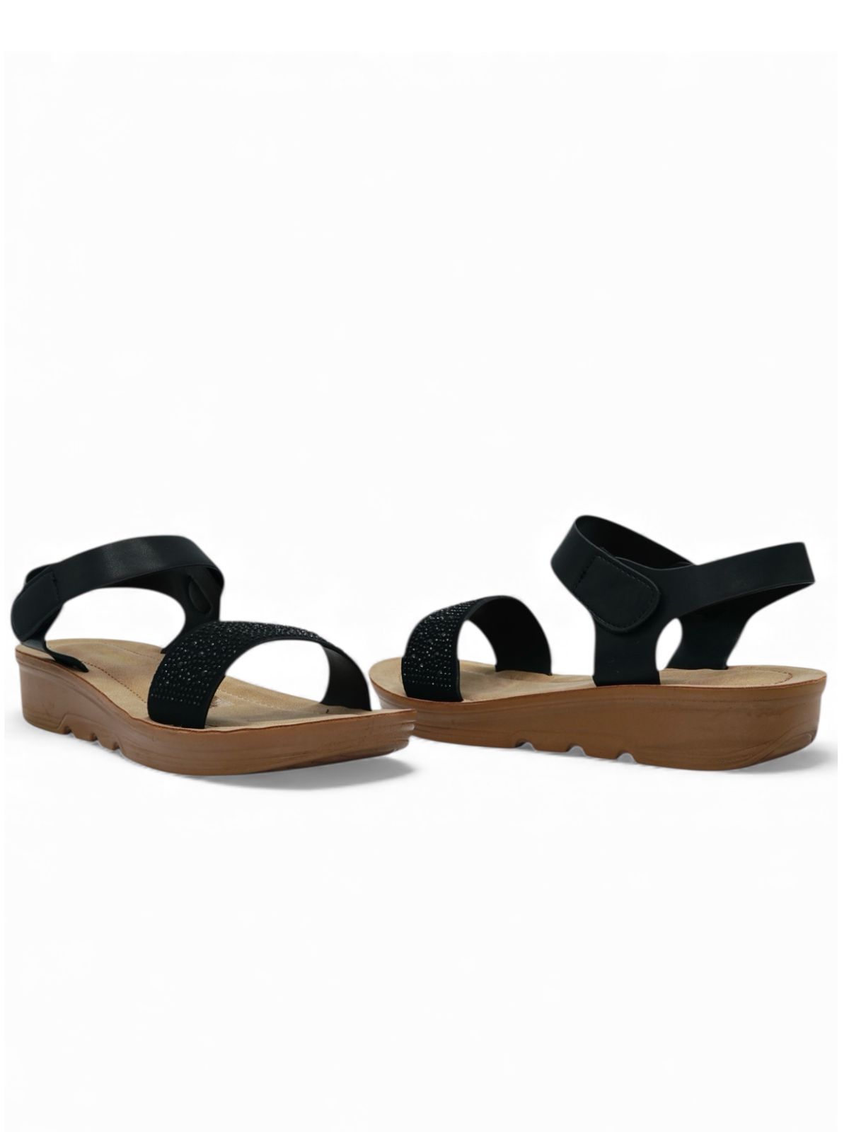 Estas sandalias negras están diseñadas para acompañarte en el día a día con comodidad y un toque moderno. Su tira frontal con brillo sutil aporta un detalle elegante sin exagerar, mientras que la pulsera suave al tobillo con cierre adherente asegura un calce práctico y firme. Son ideales para caminar, usar en la oficina, salir a hacer mandados o complementar outfits casuales con un toque femenino.