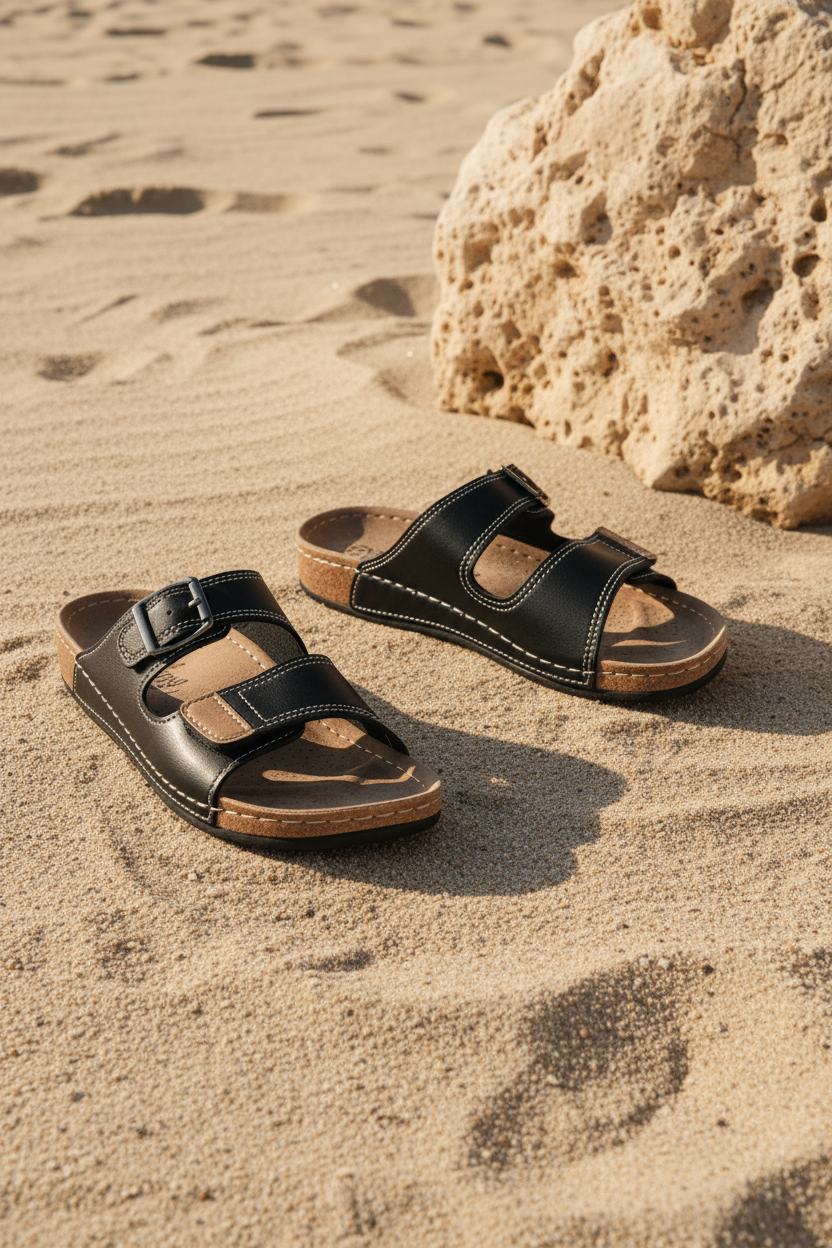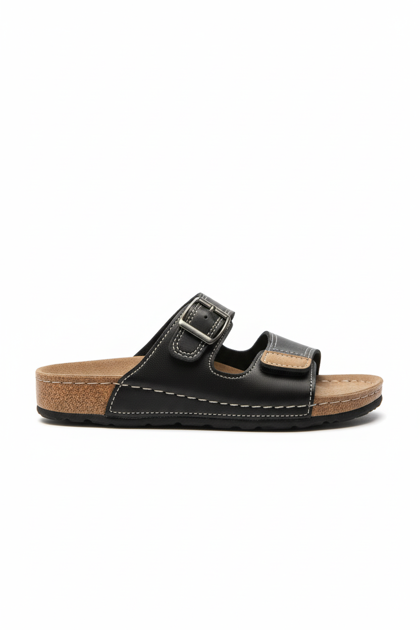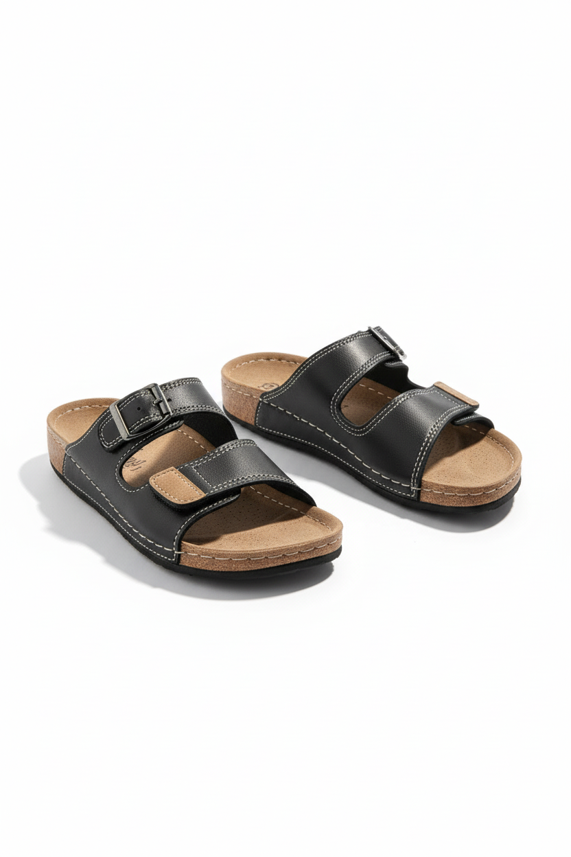 Estas sandalias estilo "bio" son sinónimo de confort absoluto y funcionalidad. Su diseño clásico presenta dos tiras anchas en color negro, cada una equipada con una hebilla ajustable al tono que permite un calce personalizado y seguro. El detalle de las costuras blancas visibles añade un toque de contraste artesanal y define la silueta. La estructura se asienta sobre una suela con apariencia de corcho, que incluye una plantilla anatómica diseñada para adaptarse a la forma natural del pie, garantizando descanso en cada paso.