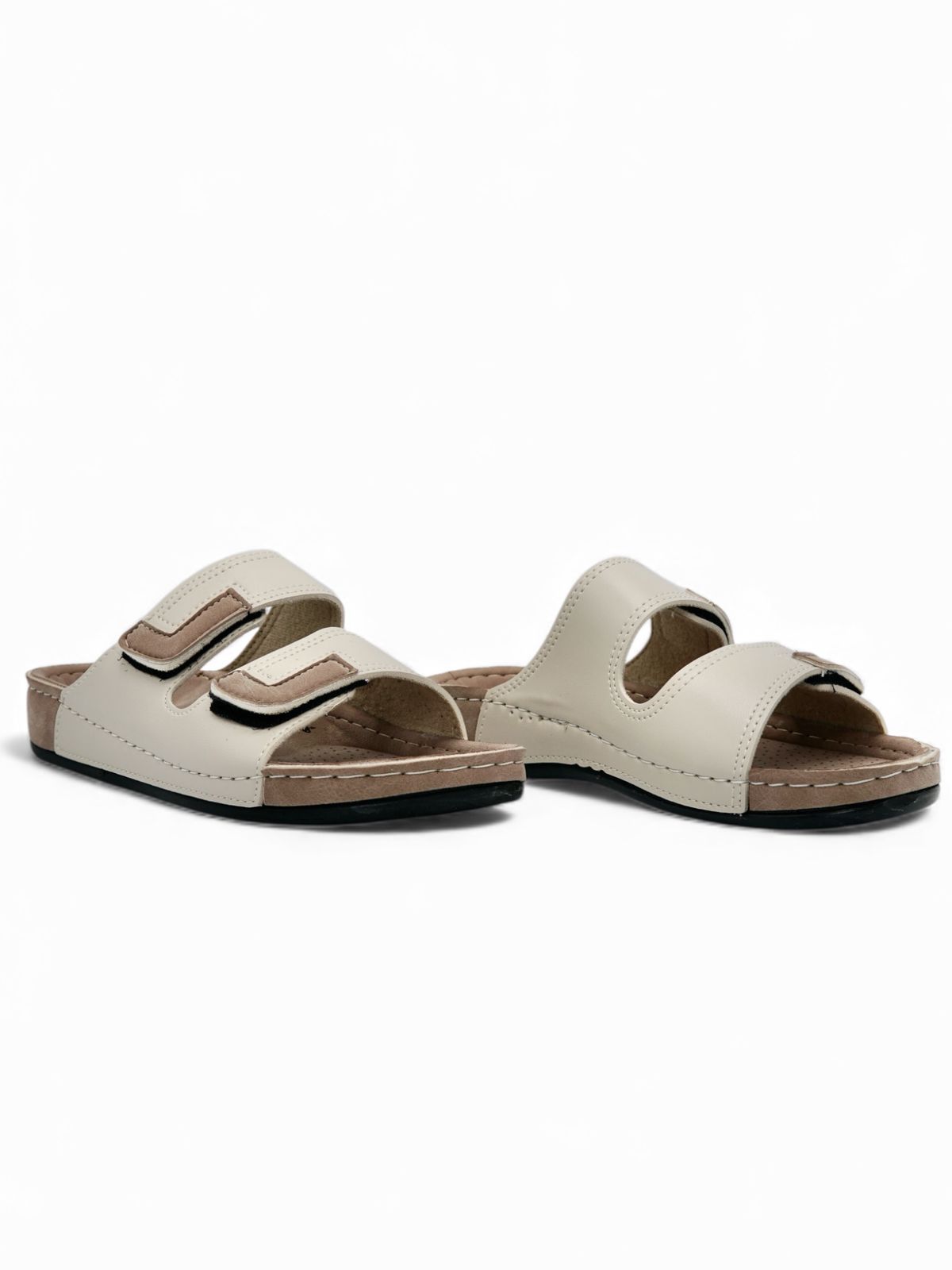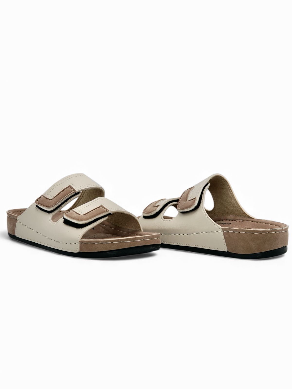 Estas sandalias blancas estilo Komfort están diseñadas para brindar suavidad y soporte en cada paso. Su diseño con doble correa acolchada ofrece un ajuste cómodo y seguro, mientras que la combinación de tonos beige y blanco crea un look fresco, limpio y versátil. Ideales para el día a día, caminatas o para quienes buscan comodidad sin perder estilo.